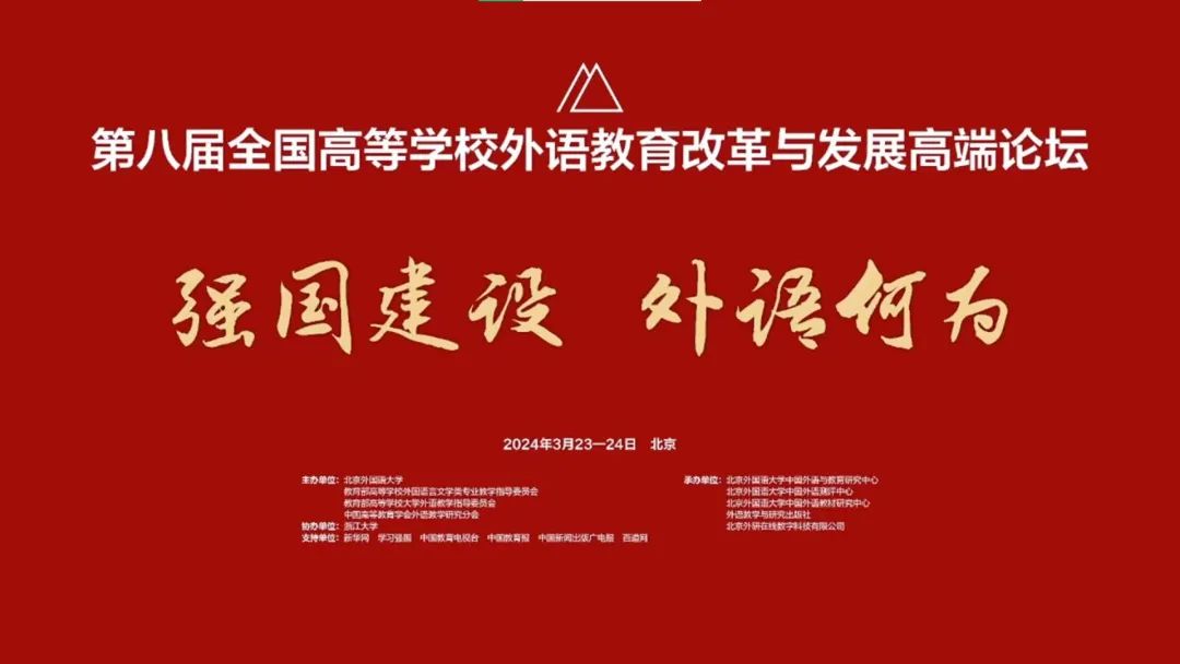 为贯彻落实党的二十大精神,引领中国高等外语教育高质量发展,2024年3月23日至24日,以“强国建设 外语何为”为主题的第八届全国高等学校外语教育改革与发展高端论坛在北京举办。教育部高等教育司副司长武世兴、浙江大学教授何莲珍、北京师范大学教授李芒、北外教授王文斌、新华社高级记者缪晓娟作主旨报告。论坛共设3场教指委论坛,10场专题论坛,研判高等外语教育发展宏观形势,探索外语教育转型创新路径,着力提高外语人才自主培养质量。我校外国语学院英语专业教研室主任刘英伟教授、大学英语教研室主任陈立丽教授参加了此次会议。