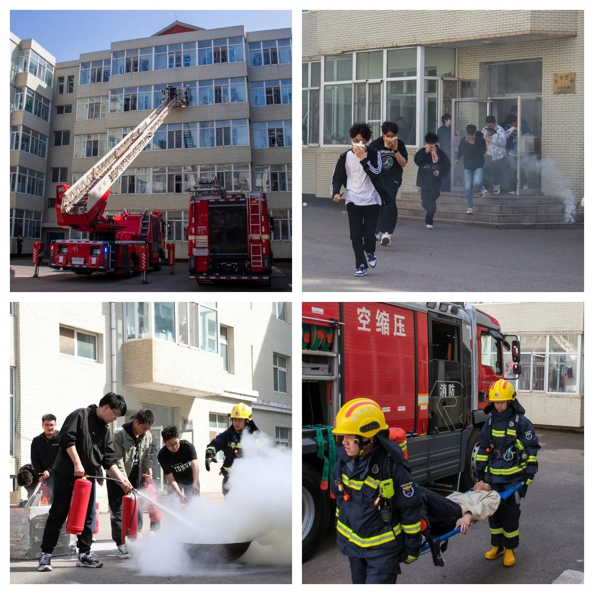 下午13:40分,春季校园消防应急疏散演练活动正式开始。演练现场,随着模拟火灾险情突发,火情警报发出并拨打119报警电话后,各部门迅速启动应急响应,志愿消防队赶赴扑救初起火灾。同时,各楼层有序组织师生紧急疏散,撤离至安全地带。净月消防救援大队迅速出警,对模拟火灾现场进行处置,解救被困人员,校医院医生对模拟伤员进行紧急救治。