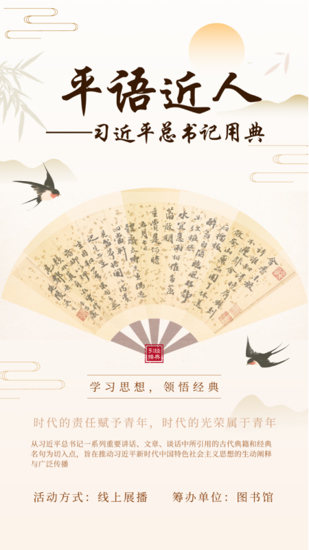 为弘扬中华传统文化,以习近平总书记喜欢的典故为主线,图书馆在已完成六集“习近平总书记用典”视频的基础上,邀请我校读者继续录制平“语”近人系列视频,预计录制十集。