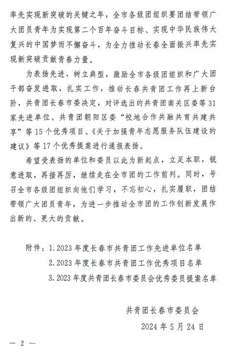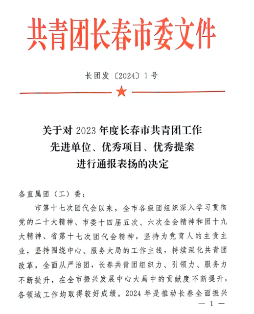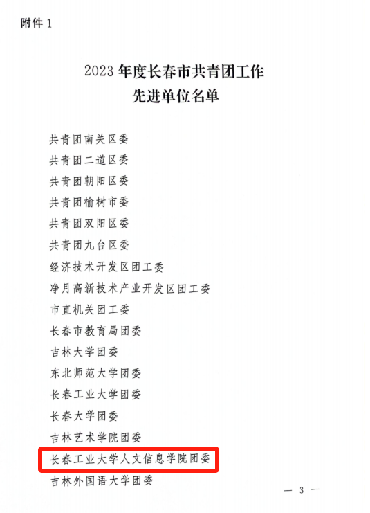 2024年5月24日,共青团长春市委员会公布了2023年度长春市共青团工作先进单位名单,长春工业大学人文信息学院团委凭借扎实的工作业绩和出色的育人成效,荣获“2023年度长春市共青团工作先进单位”。