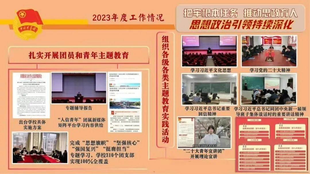 一是扎实开展团员和青年主题教育。实施团干部进支部、月度学习参考编发、团支书专题培训等多项制度,充分运用“人信青年”团属新媒体矩阵平台做好学习内容供给,学校310个团支部专题学习完成率100%。