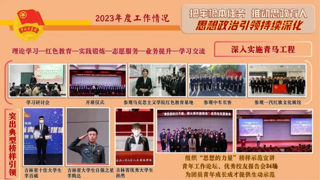 四是突出典型榜样引领。通过选树表彰,涌现出吉林省十佳大学生李百威、吉林省大学生自强之星李腾达等青年典型,组织大国工匠、全国道德模范榜样宣讲、青年工作论坛、优秀校友报告等活动15场。