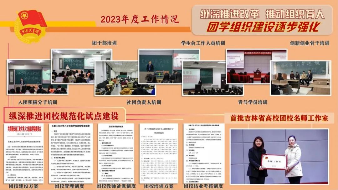 一是纵深推进团校规范化试点建设。坚持党建带团建,常态化开设入团积极分子、团干部、青马学员、学生会工作人员、创新创业骨干和社团负责人等主体培训班次,全年累计62场次。学校获评首批吉林省高校团校名师工作室。
