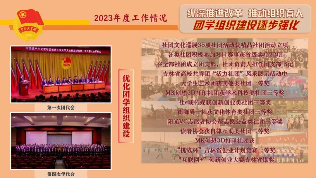 四是优化团学组织建设。顺利召开学校第一次团代会、第四次学代会,全面巩固共青团改革、学生会组织改革成效。推进41个社团规范化管理,在省级“活力社团”风采展示活动中,获评一等奖1项、三等奖5项,MK创想3D打印社团获“挑战杯”省赛一等奖、“互联网+”省赛银奖等荣誉。滑板社获长春市大学生社团文化艺术节——滑板嘉年华团体一等奖。街舞社获长春市大学生文化艺术节青少年街舞展演大赛高校组齐舞组金奖。