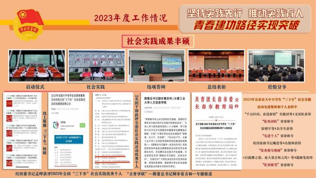 一是社会实践成果丰硕。动员千余名师生组建32支实践团队参加暑期社会实践,3支团队获全国和省级重点团队。并邀请中央民族大学和厦门南洋学院联合开展实践项目,实现了社会实践的首次跨地域合作。继2022年校团委获评全国“三下乡”社会实践优秀单位后,校团委书记孟晔获评2023年全国“三下乡”社会实践优秀个人,1支团队获评全省社会实践活动优秀团队,2名团干部获评全省社会实践活动优秀个人。共有16个集体、个人及作品在2023年长春市大中专学生“三下乡”社会实践活动评比中获得表彰。