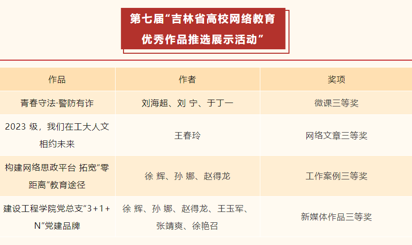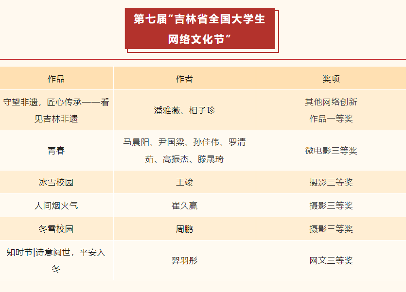近日,由吉林省教育厅主办的“吉林省全国大学生网络文化节”和“吉林省全国高校网络教育优秀作品推选展示活动”遴选结果正式公示,我校师生再创佳绩,共有10件作品荣获殊荣。