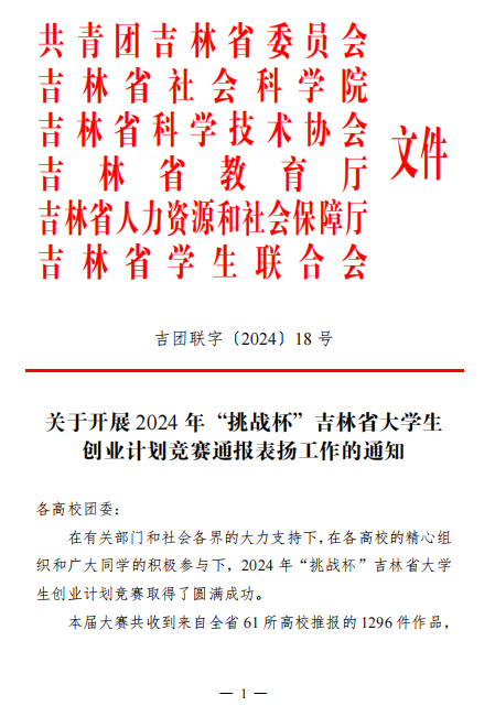 近日,共青团吉林省委员会、吉林省社会科学院、吉林省科学技术协会、吉林省教育厅、吉林省人力资源和社会保障厅、吉林省学生联合会共同发布了《关于开展 2024 年“挑战杯”吉林省大学生创业计划竞赛通报表扬工作的通知》,我校荣获普通高校组金奖1项,银奖2项,铜奖14项;社会调查专项赛金奖1项,银奖1项,铜奖7项;4位指导老师获评“优秀指导教师”。学校捧得吉林省“优胜杯”并获评“优秀组织单位”。我校入围省赛决赛作品数量、获奖数量与等级、优秀指导教师获评数量均取得历史突破。