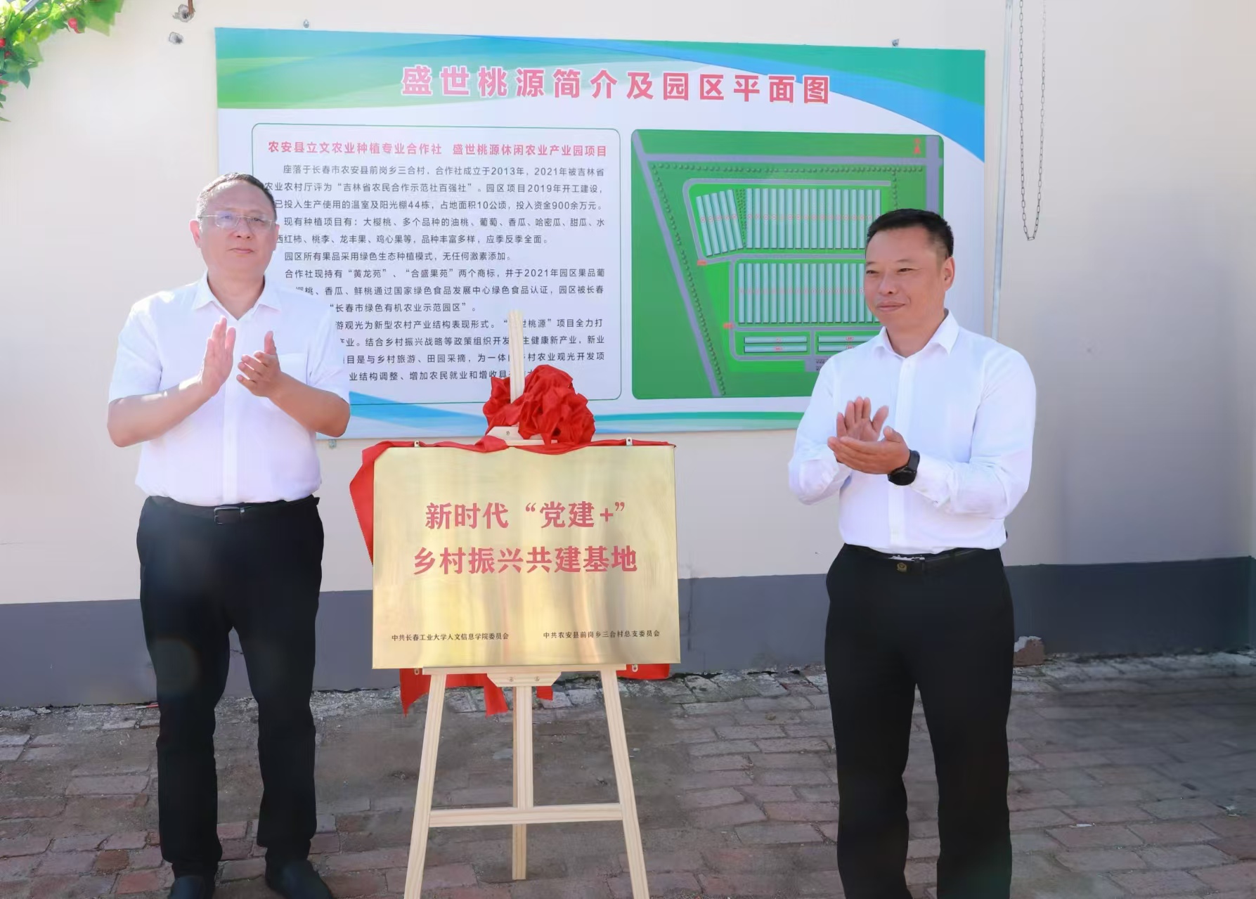 活动中,长春市委统战部副部长、市工商联党组书记、常务副主席任宏雷与我校党委书记王煊共同为“新时代‘党建+’乡村振兴基地”揭牌。