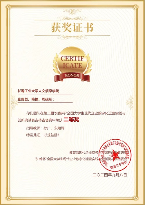 近日,由教育部现代企业商务运营课程虚拟教研室主办、重庆工商大学承办的2024年“知瀚杯”全国大学生现代企业数字化运营实践与创新挑战赛顺利落下帷幕。由我校管理学院孙广、马振楠、鞠志红、宋殿辉教师指导的3支学生代表队经过激烈的角逐,斩获3个省级二等奖。