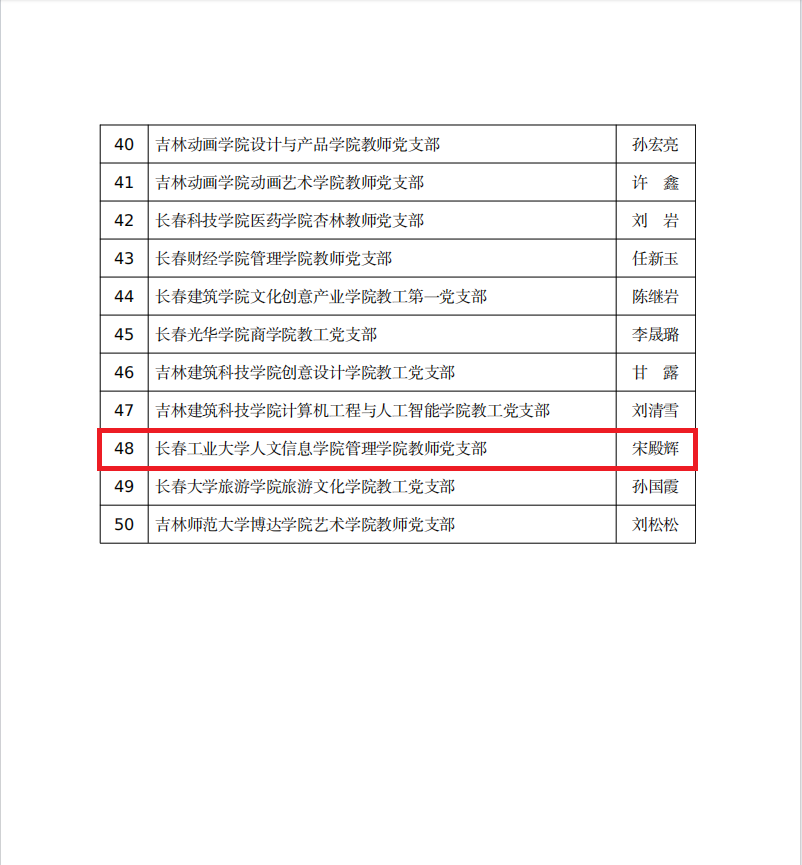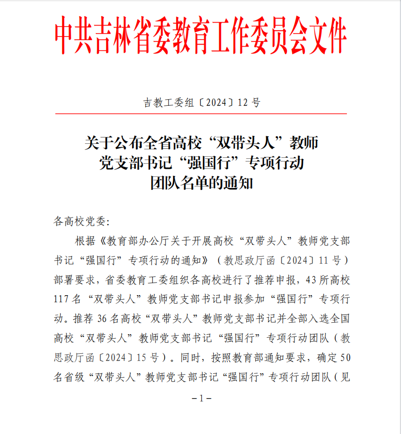 10月30日,中共吉林省委教育工作委员会发布《关于公布全省高校“双带头人”教师党支部书记“强国行”专项行动团队名单的通知》,我校管理学院教师党支部成功入选。