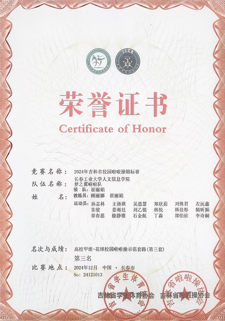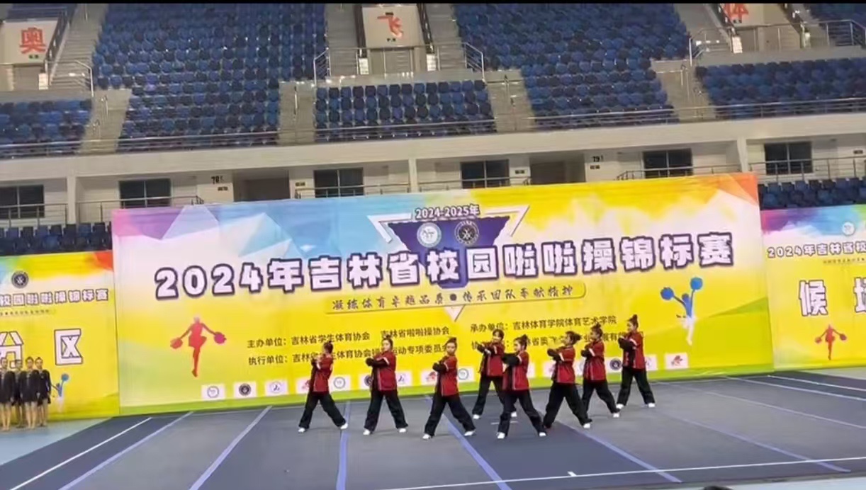 2024 年 12 月 7 日,由吉林省学生体育协会、吉林省啦啦操协会主办,吉林体育学院体育艺术学院承办的吉林省校园啦啦操锦标赛于长春奥林匹克公园篮球馆盛大开幕。我校啦啦操队在高校甲组的比赛中脱颖而出,取得了1项第二名和3项第三名的好成绩。