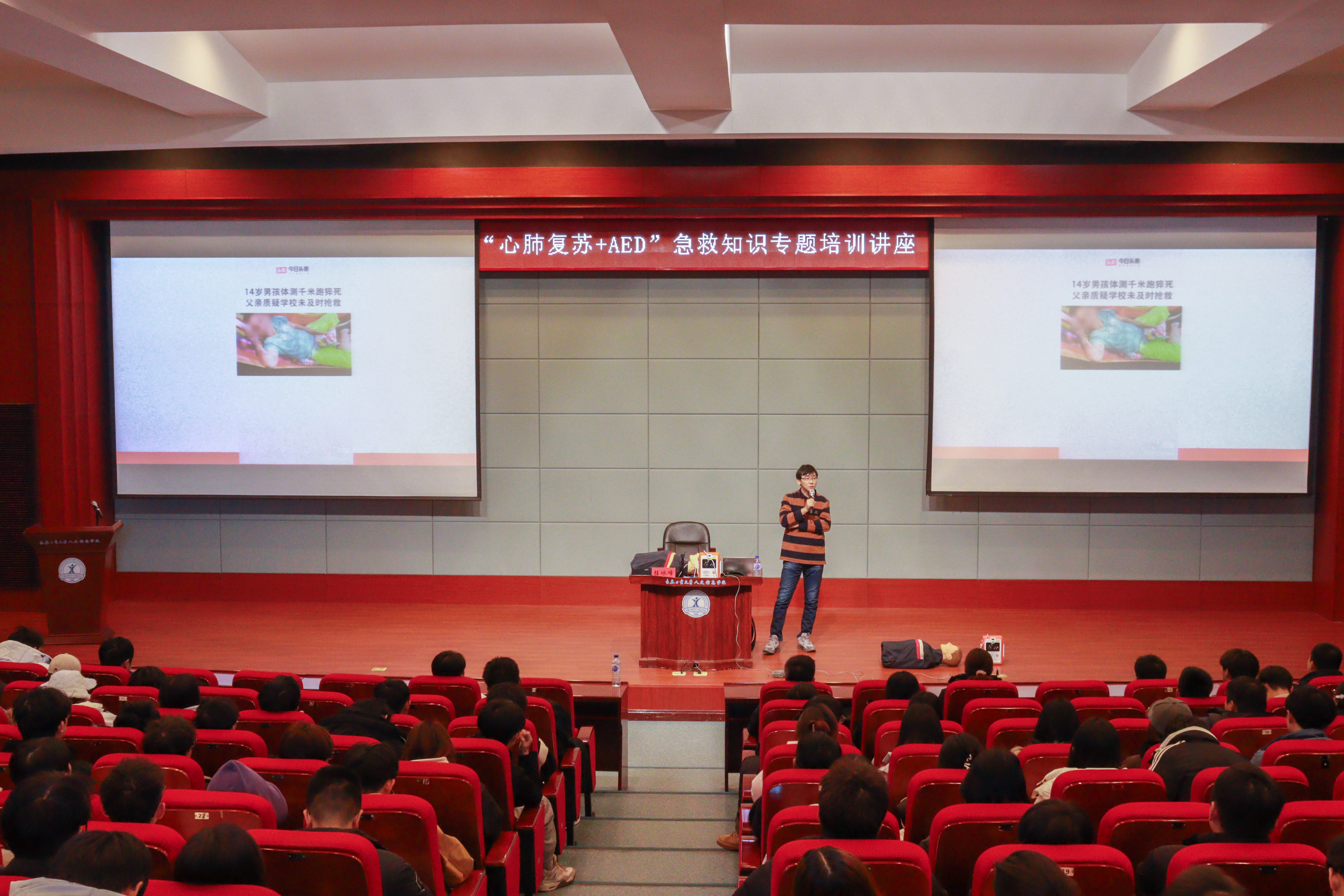 为普及应急救护知识,提高师生安全意识和应急救护能力,12月11日,学校邀请中国红十字会应急救护培训师桂冰峰主任到校为师生开展“心肺复苏+AED”急救知识专题培训讲座。本次培训重点面向在校大二、大三年级学生,每个班级选派的2名学生代表和后勤处医务室全体教师共计300余人参加培训。会议由后勤处副处长张金良主持。