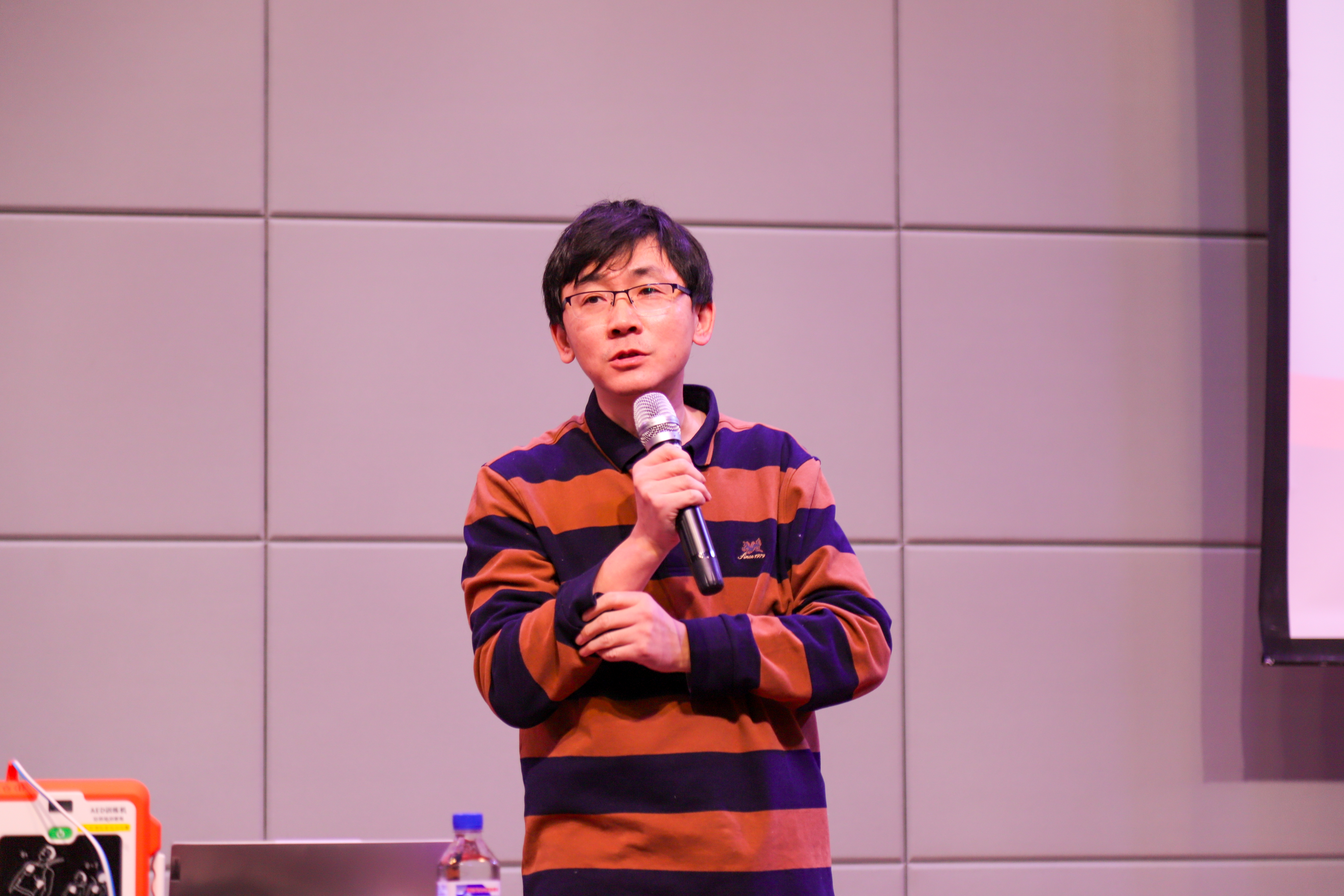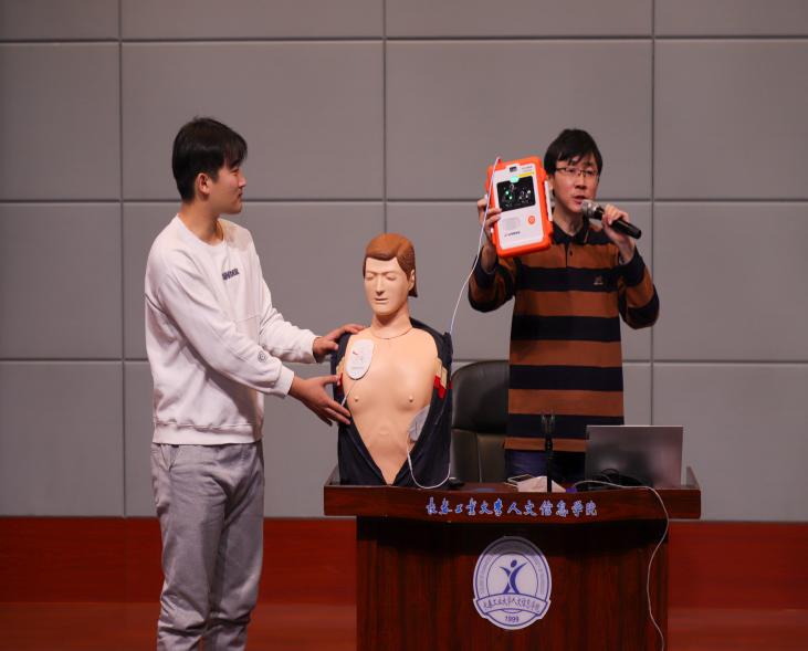 桂冰峰以心脏骤停的涵义、胸外按压的方法、人工呼吸的流程、AED自动体外除颤仪的使用规范以及急救的相关法律法规知识等为重点,理论与实践操作相结合,以专业的知识讲解、规范的操作指导和丰富的案例分析为师生上了一堂内容丰富的急救培训课。