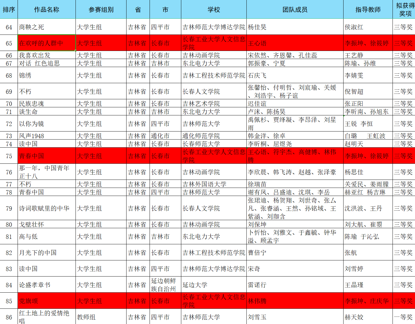 大赛以体悟中华优秀文化内涵,丰富文化思想实践,激发文化自信自强为宗旨,通过网络平台征集参赛作品。经初赛选拔、复赛、决赛层层评审,我校管理学院王心语同学的作品《在欢呼的人群中》和林伟滕同学的作品《党旗颂》荣获吉林省大学生组个人三等奖,王心语、符宇杰、高健博、林伟腾的作品《青春中国》荣获吉林省大学生组团队三等奖。李振坤、庄庆华、徐筱婷三位教师获优秀指导教师奖。