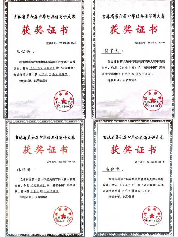 为贯彻落实党的二十大精神,服务教育强国、文化强国建设,加大国家通用文字推广力度,传承发展中华优秀语言文化,落实全国青少年读书行动,教育部、国家语委主办了以“典耀中华,赓续文脉”为主题的第六届中华经典诵写讲大赛。我校管理学院师生在大赛中荣获吉林省大学生组个人三等奖两项、团队三等奖一项的好成绩。