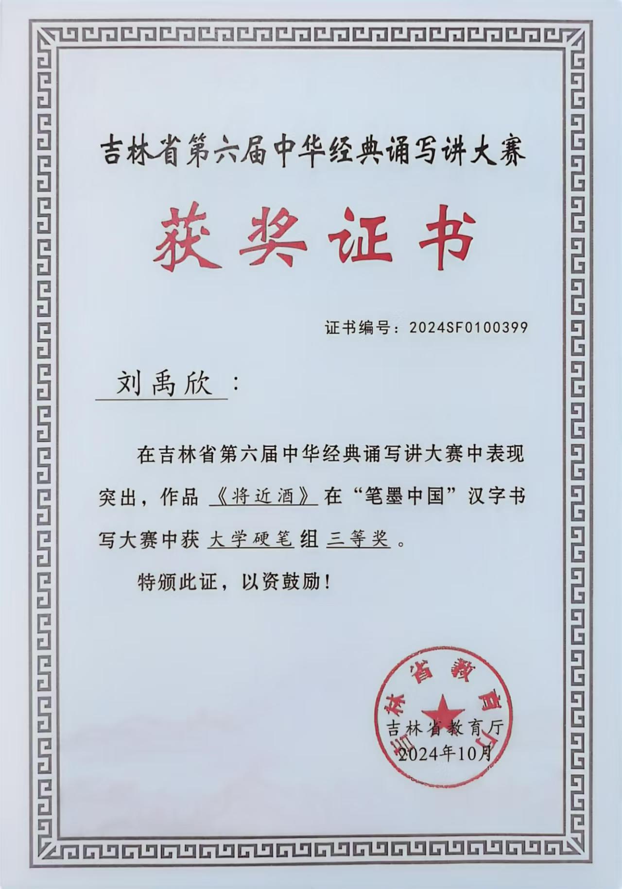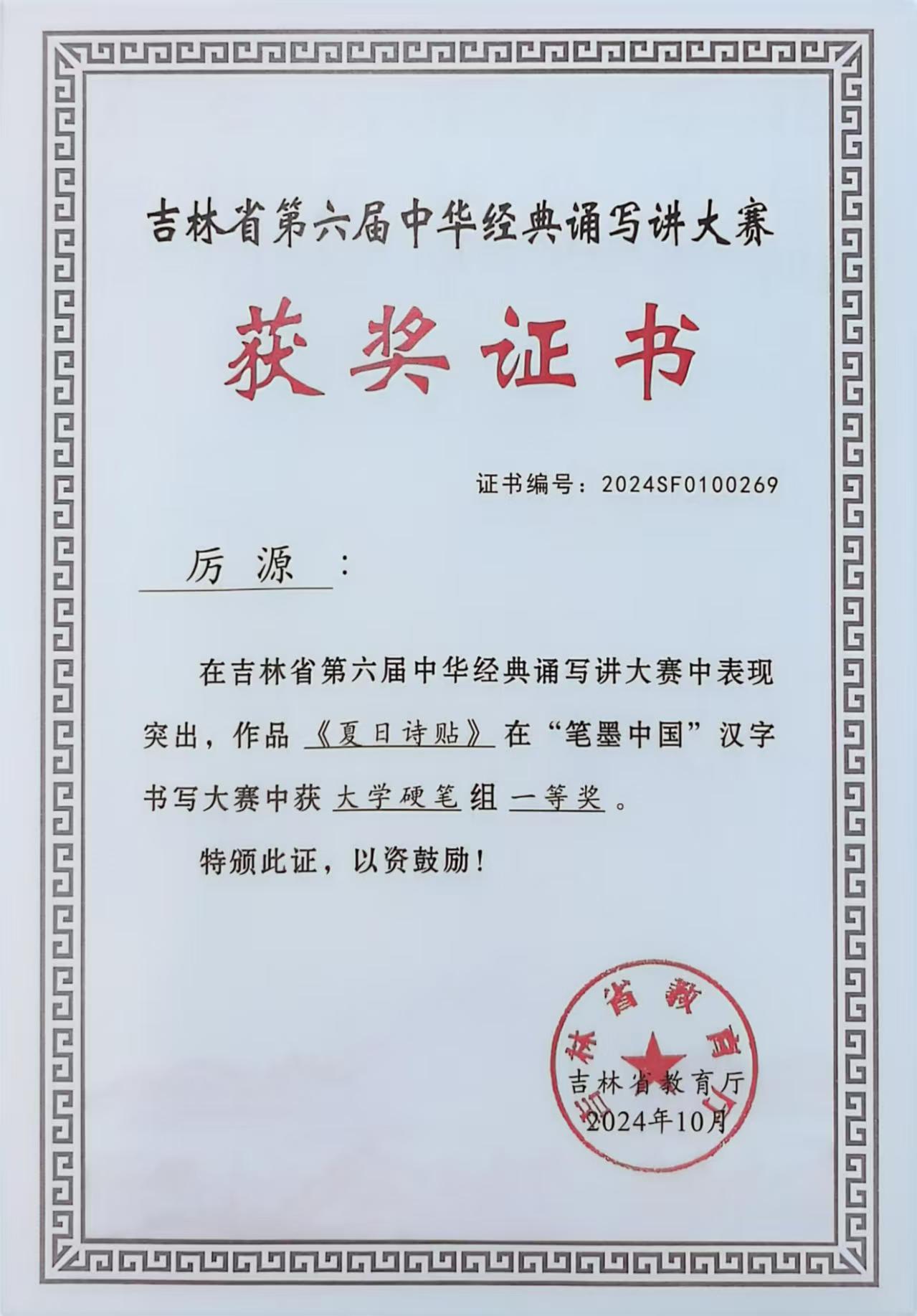 在刚刚结束的由教育部、国家语委举办的第六届“笔墨中国”经典诵写讲大赛中,我校法学院学生厉源的作品《夏日诗贴》获省级大学硬笔组一等奖,管理学院学生相子珍的作品《陋室铭》、计算机科学与工程学院学生崔译菲的作品《将进酒》、电气与电子工程学院学生刘禹欣的作品《将进酒》获省级大学硬笔组三等奖,王方获优秀指导教师奖。其中厉源凭借其卓越的作品《夏日诗贴》,直接进入国赛,并在全国4119件作品中最终荣获国家级优秀奖,突破了我校学生的最好成绩。