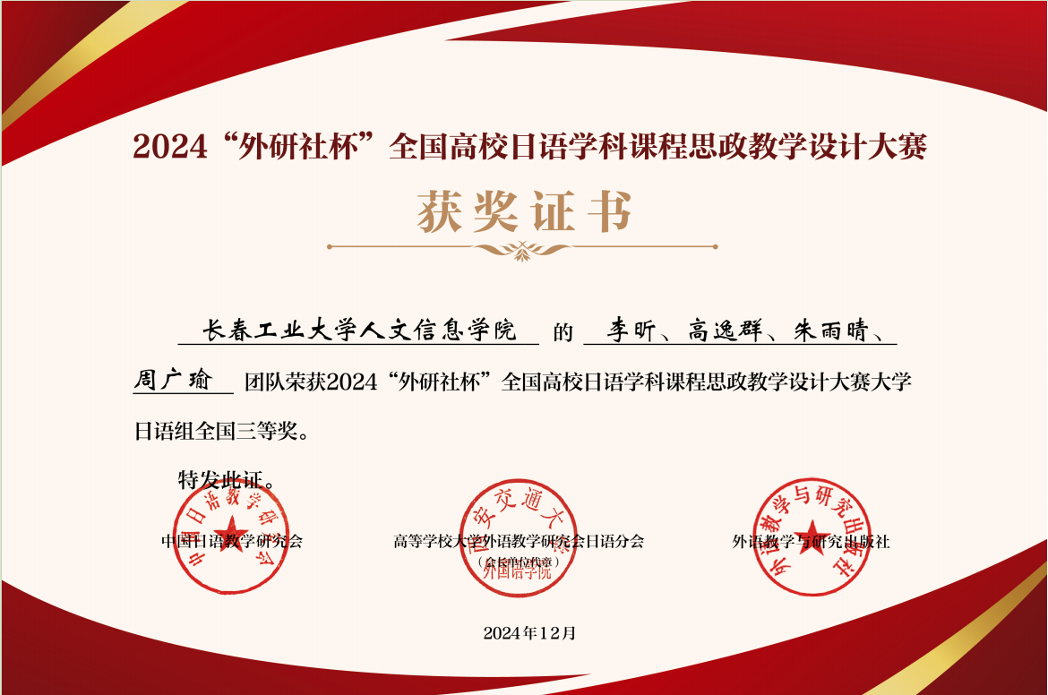 近日,2024“外研社杯”全国高校日语学科课程思政教学设计大赛获奖名单公布,我校外国语学院日语专业李昕、高逸群、朱雨晴、周广瑜教师团队荣获大学日语组全国三等奖。