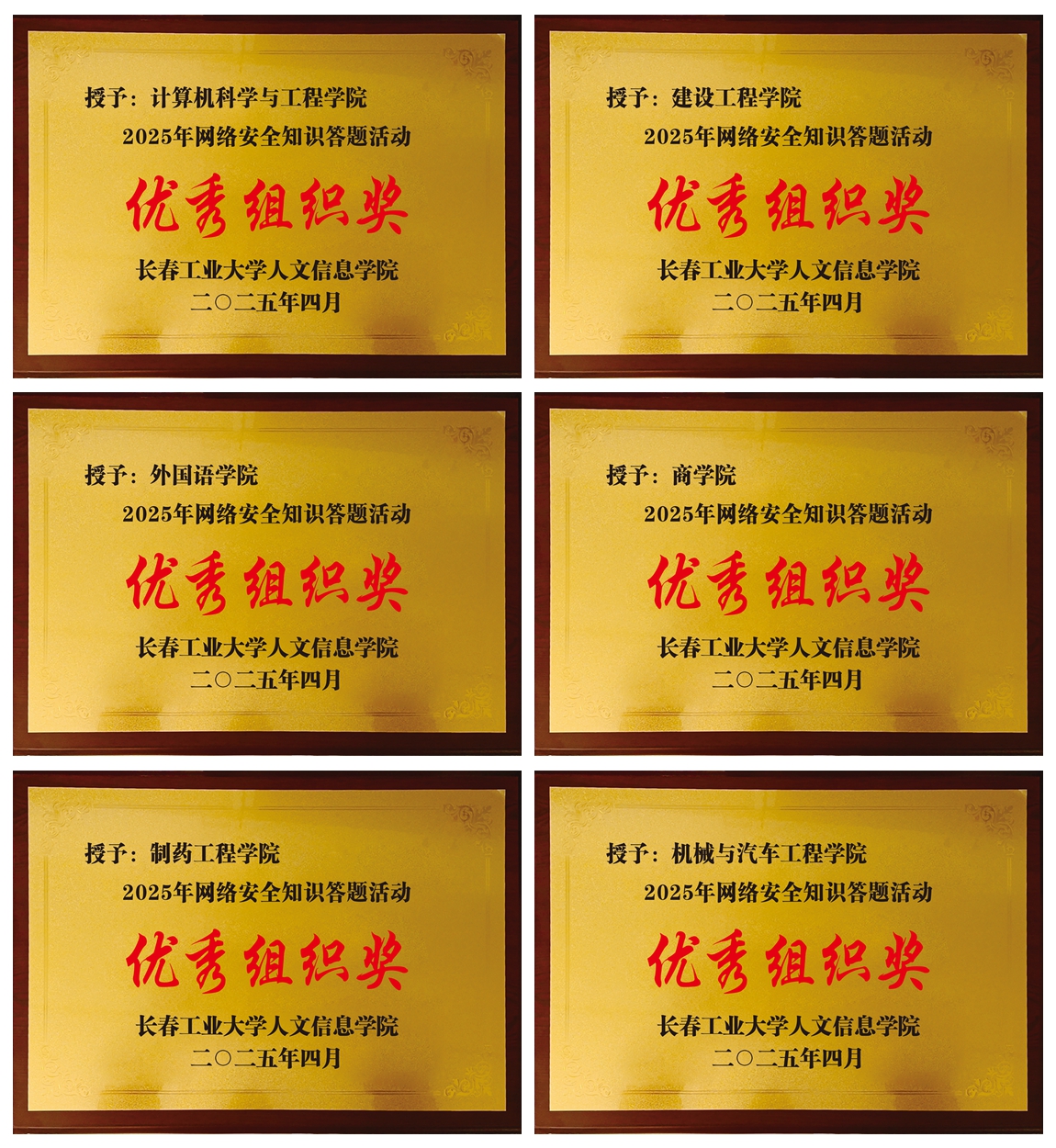 本次网络安全知识答题活动内容涵盖网络安全法律法规、网络诈骗防范、个人信息保护、网络行为规范等实用知识,并融入真实案例解析,助力师生增强网络安全意识、提高网络安全防范能力。学校根据活动参与人数、参与率、答题成绩、答题速度等进行评选和排名,计算机科学与工程学院、建设工程学院、外国语学院、商学院、制药工程学院、机械与汽车工程学院等6个部门荣获优秀组织奖,60名师生获优秀个人奖。