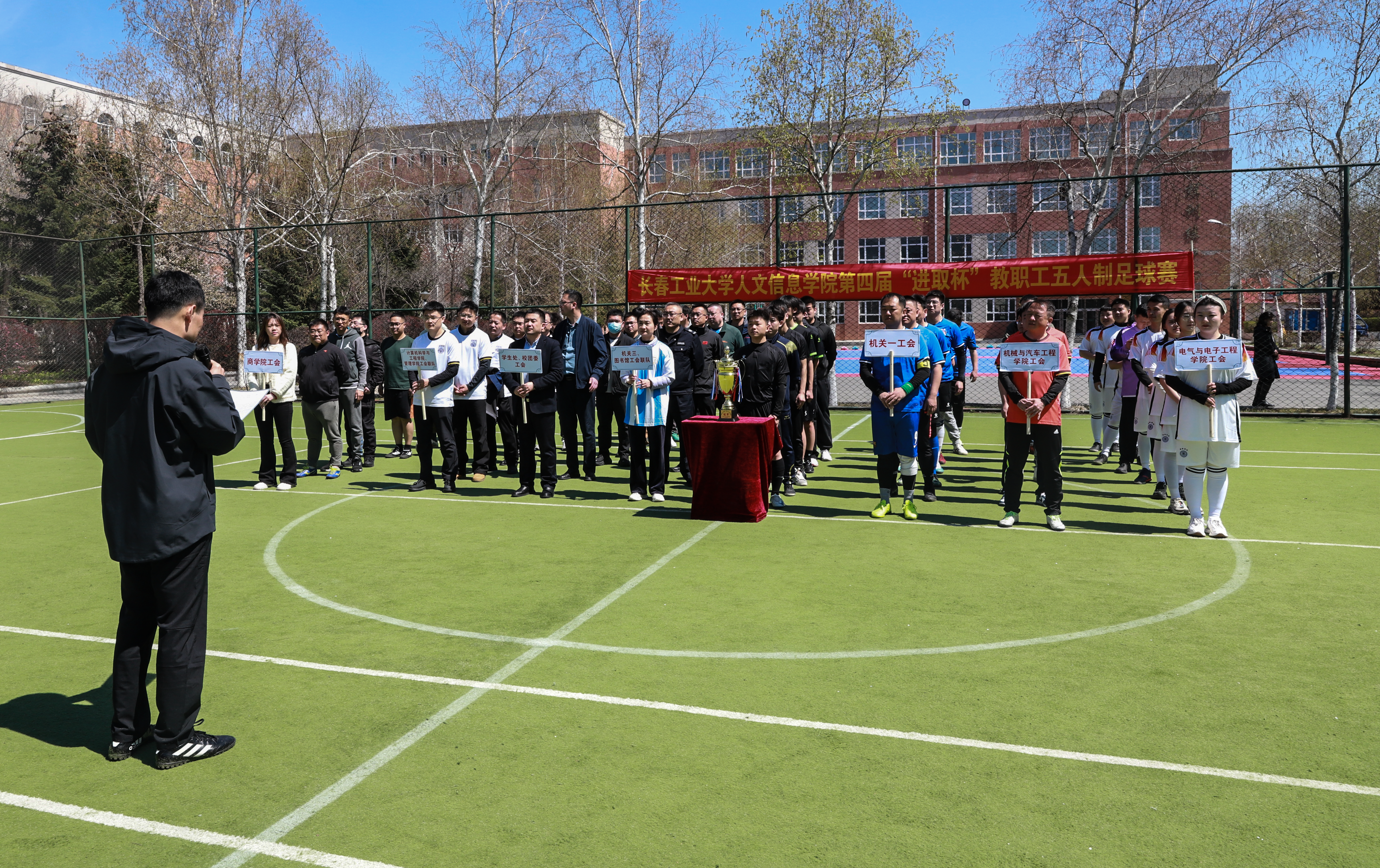 4月27日,由学校工会主办,教职工足球协会承办,体育教研部、后勤处协办的第四届“进取杯”教职工五人制足球比赛在学校足球场拉开帷幕。学校副校长、工会主席李晓科致开幕词。工会常务副主席、机关党委书记范悦主持开幕式。