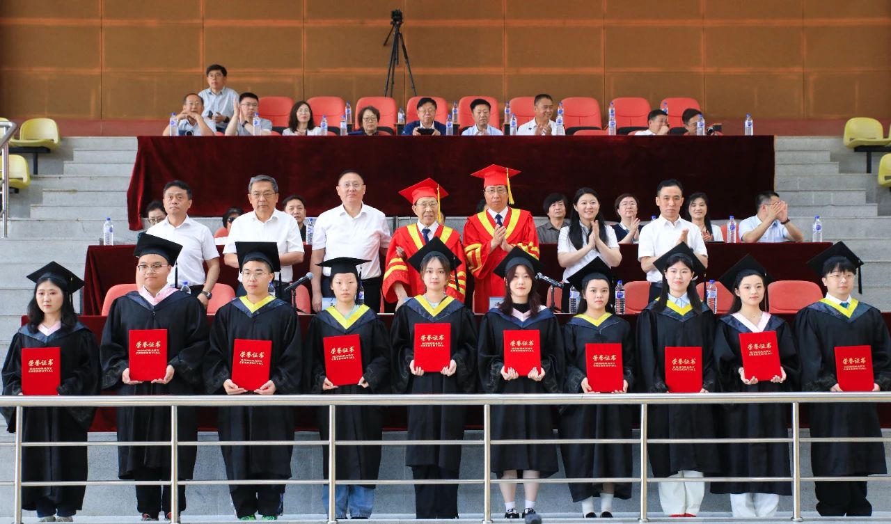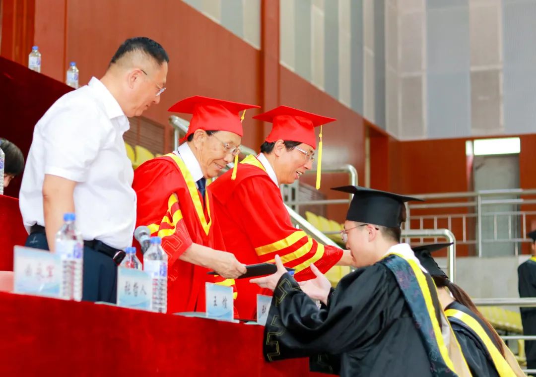 典礼现场,张兆华、潘福林为毕业生代表拨穗正冠授予学位,并颁发毕业证书、学位证书。学校领导为优秀毕业生代表颁发荣誉证书。