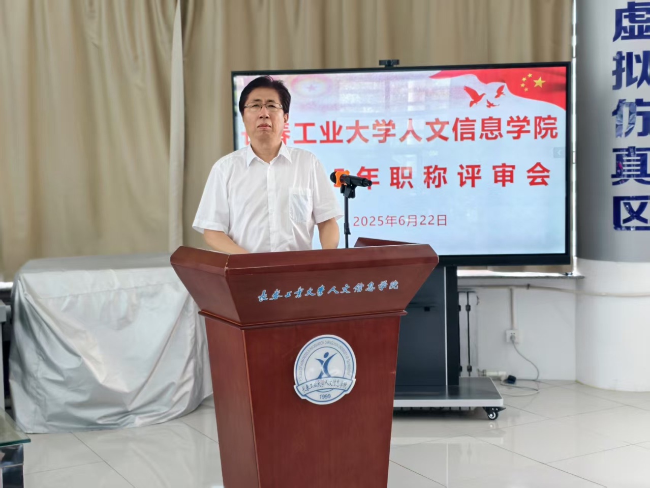 6月22日,学校在第四教学楼多功能厅召开了2025年职称评审会议。25名校内外评委参会。人事处处长白志勇向评委会介绍了本次职称评审工作简况,宣读了会议议程。