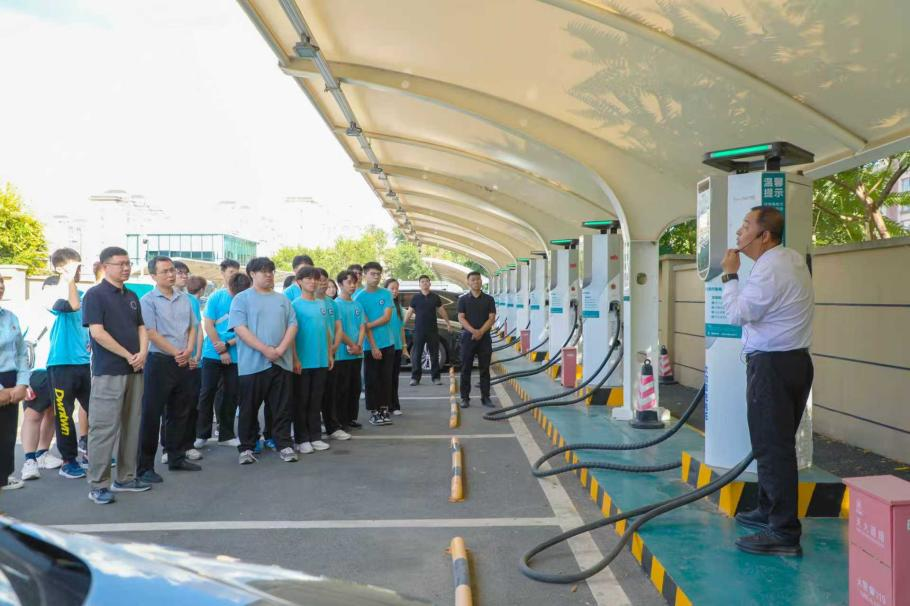 研学最后一站,师生们来到长电众泰充电站。这里不仅是省内单体面积最大、充电能力最强、充电设备最佳、服务配套最优的充电站,也是我市构建以新能源为主体的新型电力系统的重要设施。