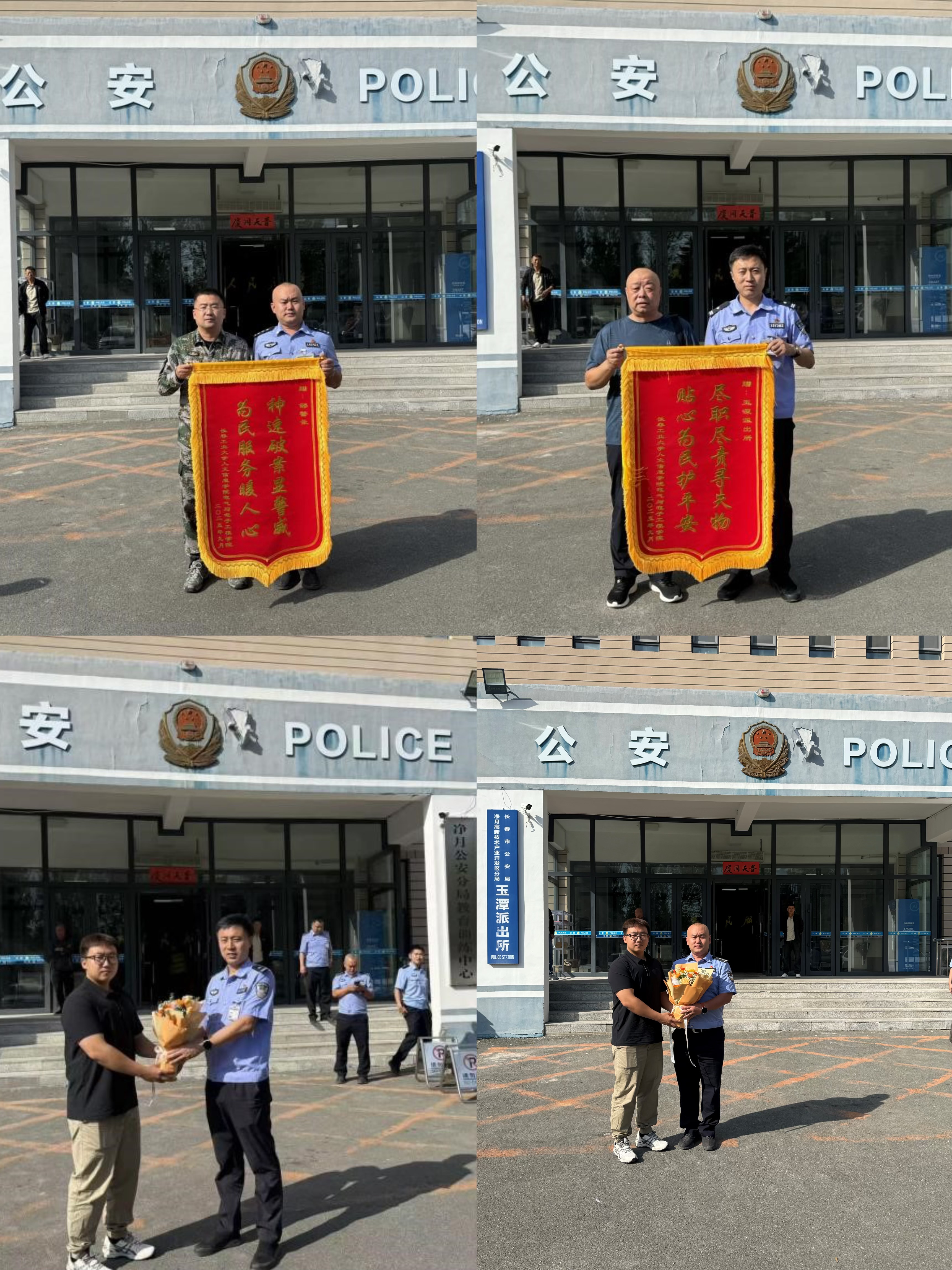 “破案神速解民忧,人民公安为人民”。9月15日下午,学校学生工作处处长庞旭、安全工作处处长刘强、电气与电子工程学院党总支书记陈思阳以及安全工作处相关同志、学院辅导员一行前往长春市公安局净月区分局玉潭派出所赠送锦旗,表达谢意。玉潭派出所王艳成所长、邹继权警长热情接待学校一行人员。