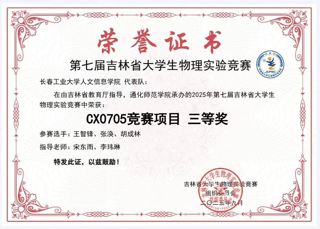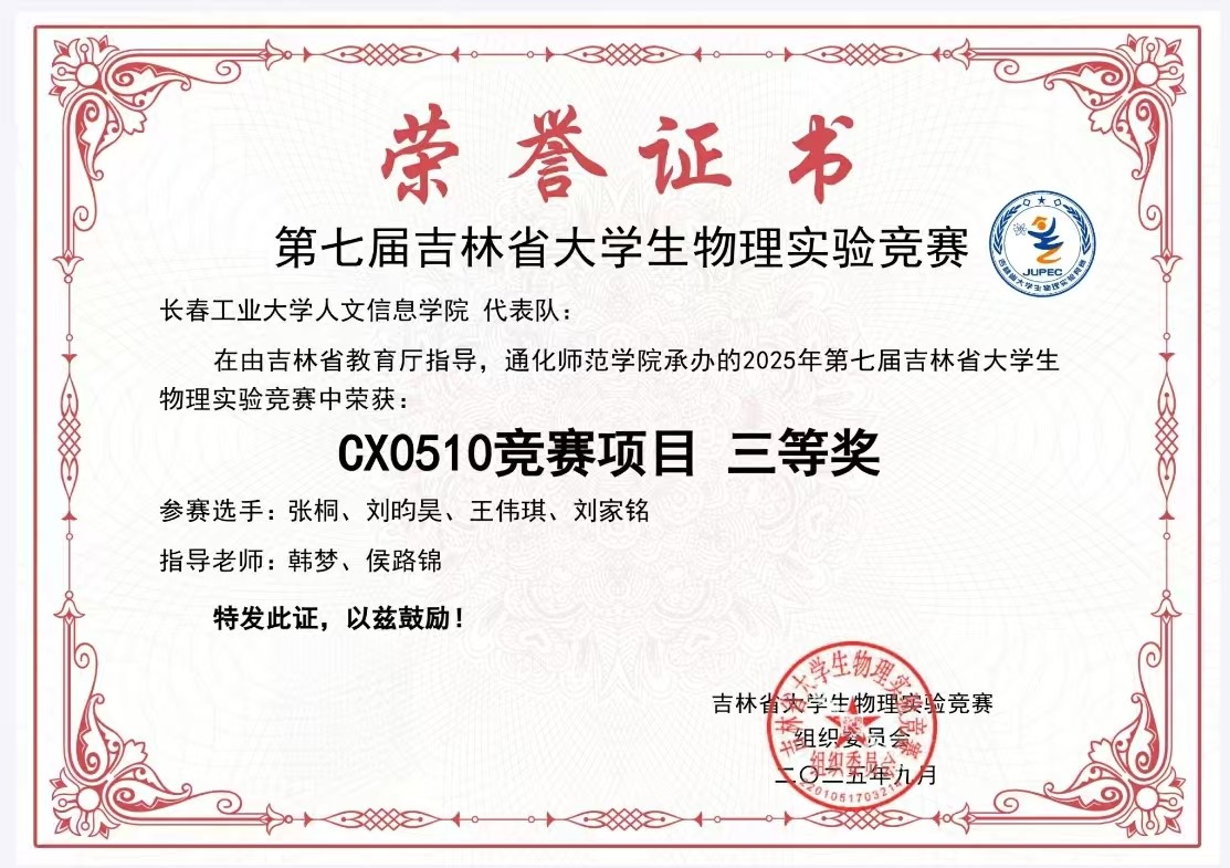 819日至20日,第七届吉林省大学生物理实验竞赛决赛(2025)在通化师范学院举行,共有来自全省22所高校的224支代表队649名选手参加了比赛。通过网络初赛和现场决赛,我校荣获二等奖1项,三等奖6项。