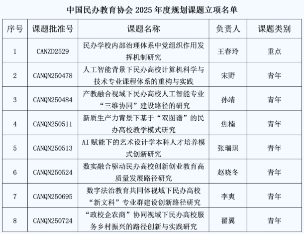 近日,中国民办教育协会正式公布2025年度规划课题立项名单,我校王春玲等8名教师申报的课题成功获批立项,其中包括重点课题1项、青年课题7项,立项总数创我校在该协会课题申报中的历史新高。