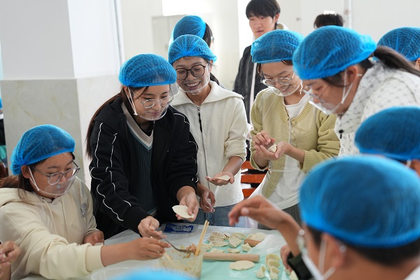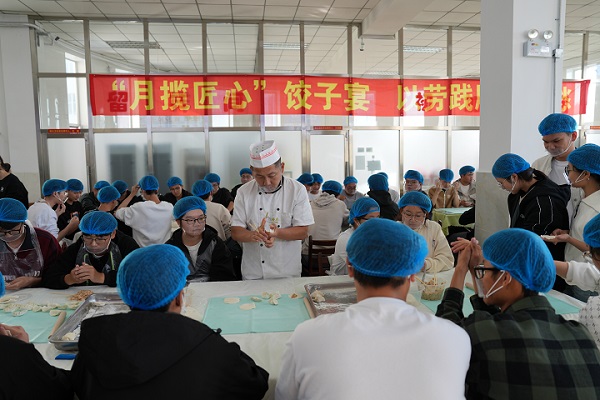 这是学校在中秋假期举办的“月揽匠心”饺子宴现场。从和面、擀皮到调馅、包制,同学们在师傅的指导下亲手实践,不少人是第一次包饺子。