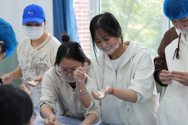 操作台上,北方的同学熟练地捏出月牙饺、元宝饺,南方的同学则尝试融入家乡特色,包出花边、柳叶等造型。不一会儿,形态各异的饺子就摆满了餐盘。随着饺子陆续下锅,同学们自发整理台面、清洗工具,在协作中分享家乡的中秋习俗,畅谈大学生活的憧憬。