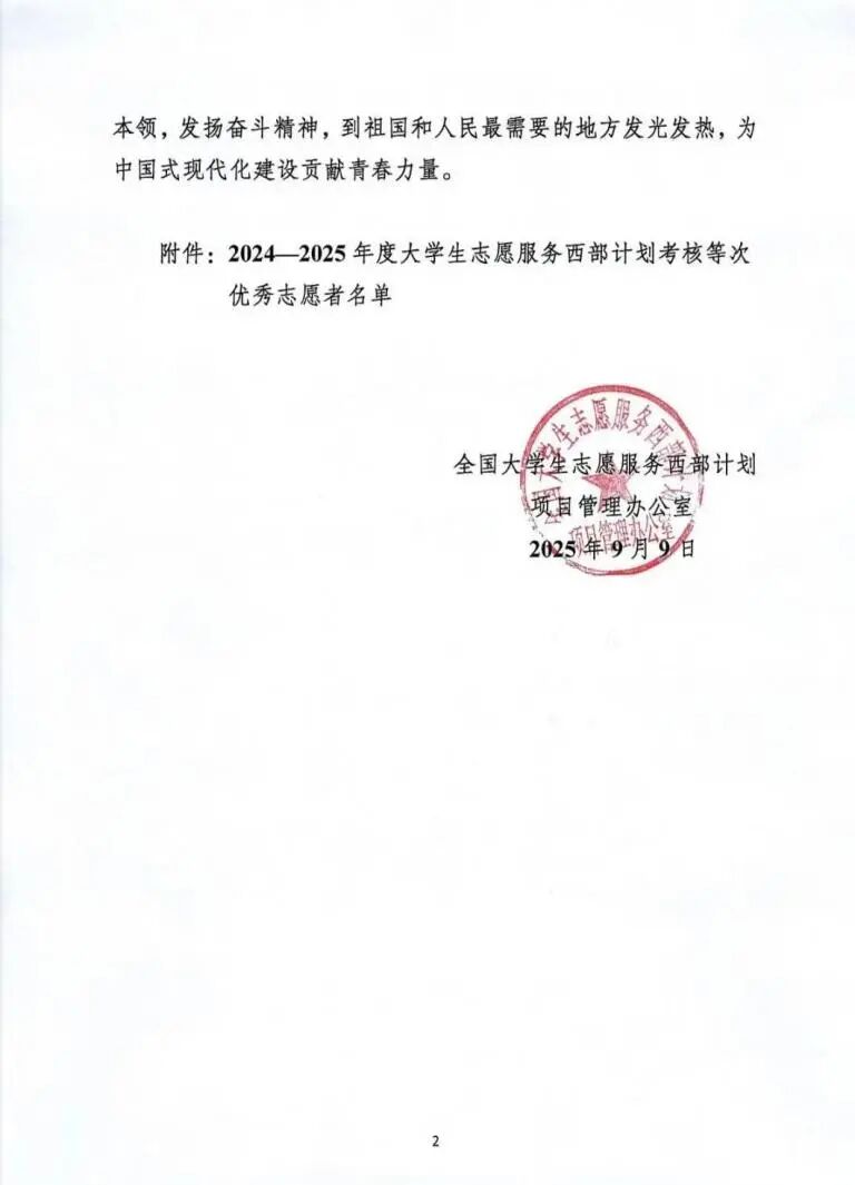 近日,全国大学生志愿服务西部计划项目管理办公室印发《关于印发2024-2025年度大学生志愿服务西部计划考核等次优秀志愿者名单的通知》(全国项目办发〔20254号)。我校曹嘉琦、付雨、姚佳希、陈瑞爽、史颜明、张意阳6名同学凭借扎实的服务表现、突出的岗位贡献获评考核等次优秀志愿者,生动诠释了我校学子的责任使命。