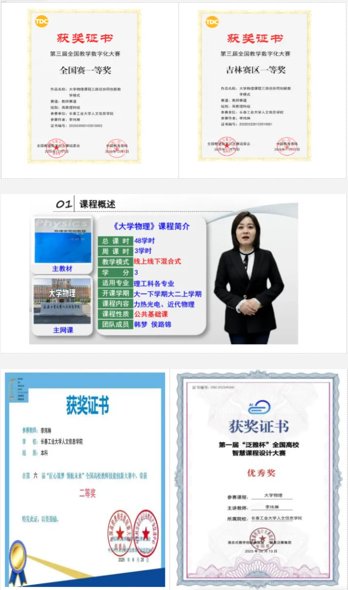 2025年以来,李玮琳《大学物理》团队持续深耕教学创新,先后获得第六届“匠心筑梦 领航未来”全国高校教师技能创新大赛全国二等奖、第一届“泛雅杯”全国高校智慧课程设计大赛优秀奖等多项荣誉,展现了我校教师在教学改革方面的扎实积累与持续突破。