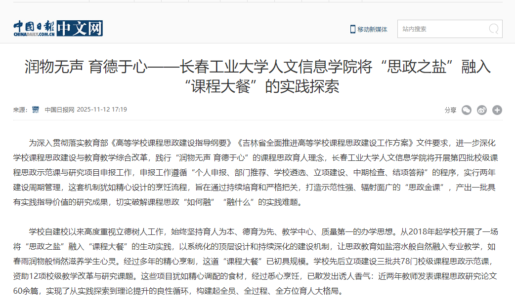 近日,中国日报网等媒体以《润物无声 育德于心——长春工业大学人文信息学院将“思政之盐”融入“课程大餐”的实践探索》为题,深度报道了我校课程思政建设与教育教学综合改革工作,特别聚焦了学校课程思政建设系统化的顶层设计和持续深化的建设机制,以及学校让思政教育如盐溶水般自然融入专业教学的特色做法。