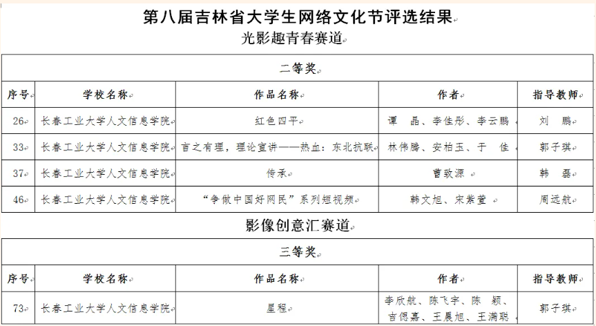 近日,吉林省教育厅下发了《关于公布第八届吉林省大学生网络文化节和高校网络教育优秀作品推选展示活动获奖名单的通知》。经作品申报、资格审核、专家评审,我校学生作品在吉林省“大学生网络文化节”活动中获得二等奖4项、三等奖1项;我校教师作品在吉林省“高校网络教育优秀作品推选展示活动”中获得二等奖1项。