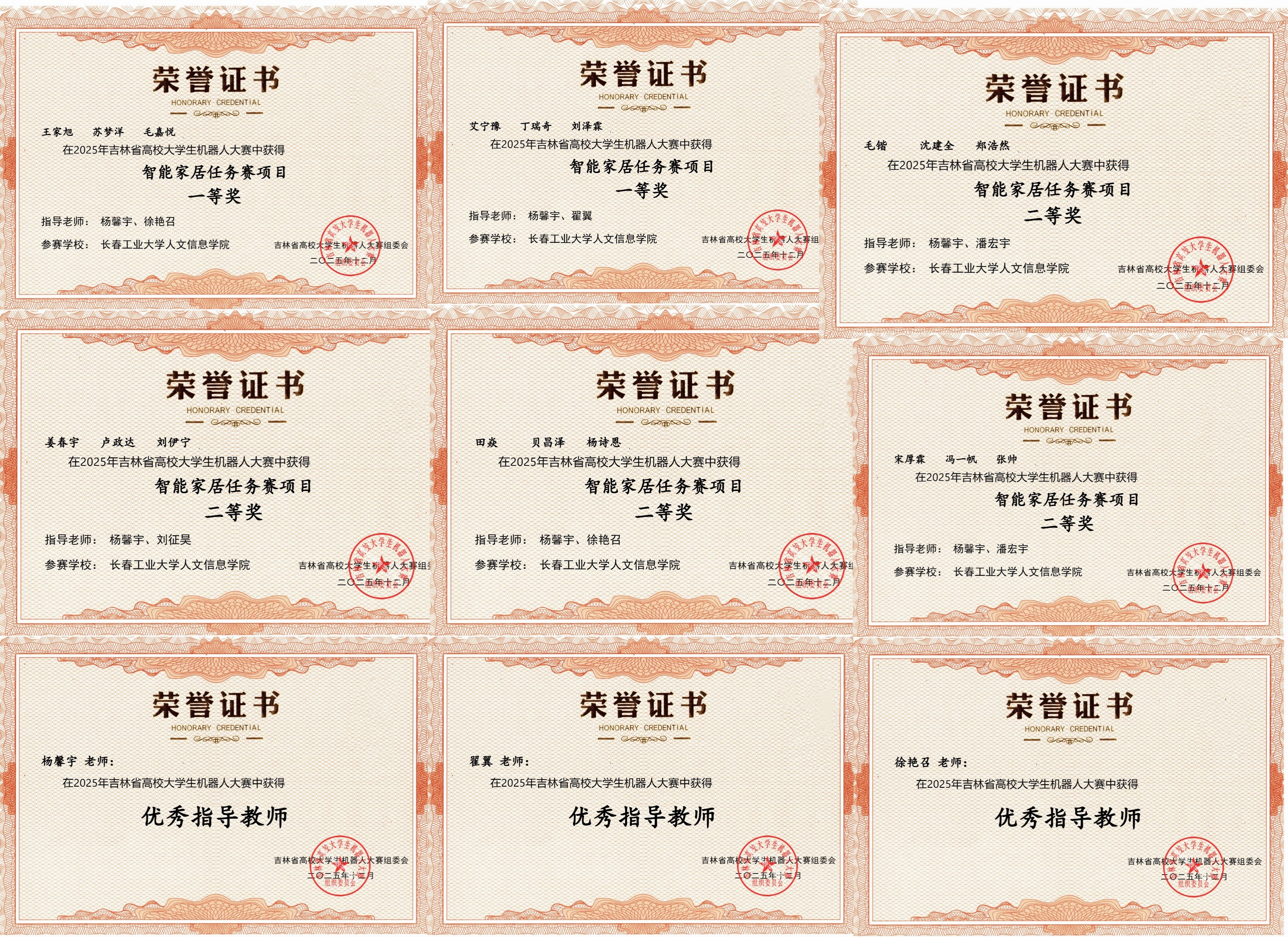 近日,由吉林省教育厅、吉林省科学技术协会指导,吉林省人工智能学会主办,长春理工大学承办的2025年第八届吉林省高校大学生机器人大赛在长春理工大学圆满落幕。我校建设工程学院以LOFT创新社团和无人机技术与应用微专业为依托,组织学生积极备赛,挑战智能家居跨学科难点,在智能家居任务赛中成功斩获一等奖2项、二等奖4项,杨馨宇、徐艳召、翟翼三位指导教师荣获优秀指导教师