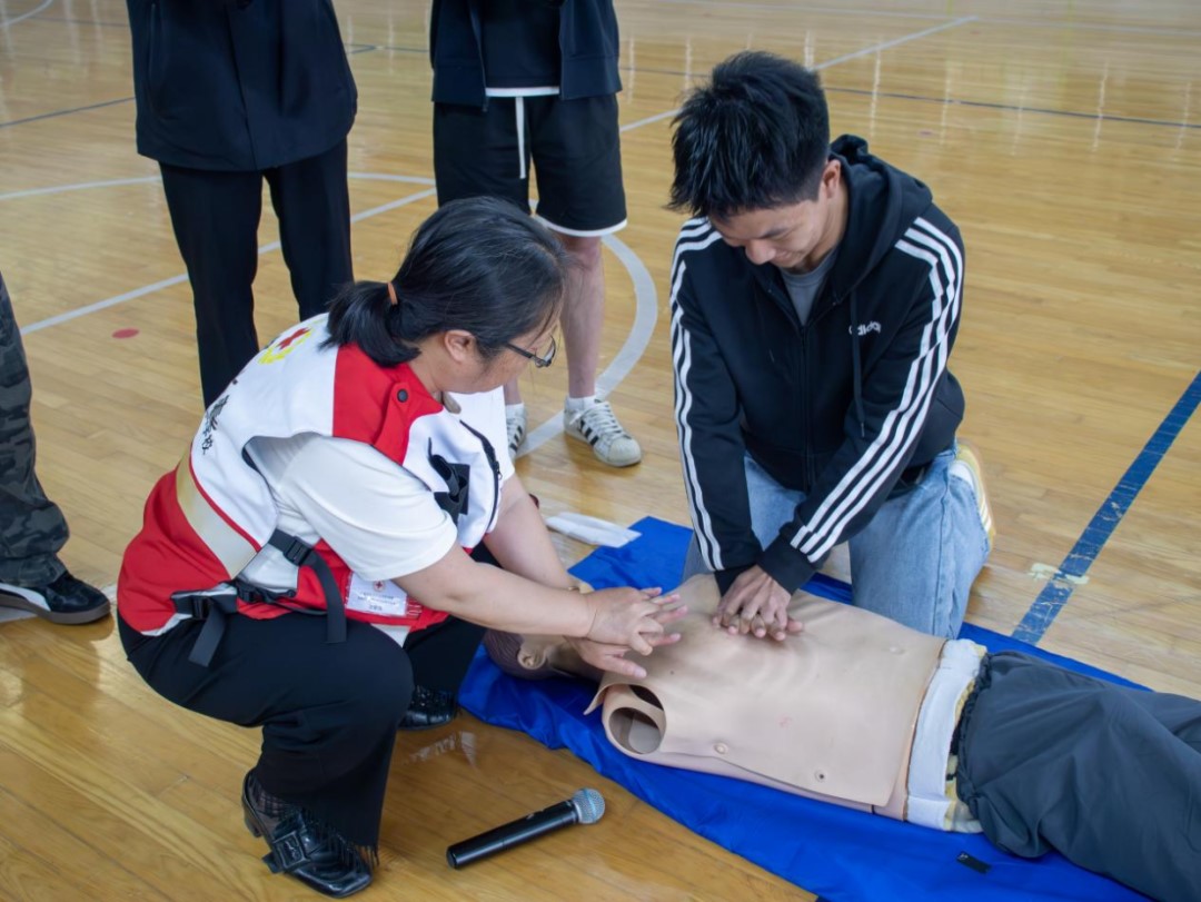 张春英重点从中国红十字的主要工作、心肺复苏(CPR)概述及程序、自动体外除颤器(AED)原理及用法三方面进行讲授。同时,结合案例数据、点位讲解和医疗术语,为师生带来一堂实用、专业的急救技能培训课。
