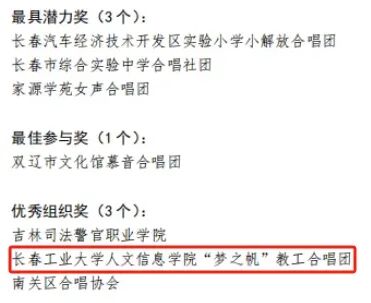 近日,在长春市第三届市民合唱季活动中,我校“梦之帆”教工合唱团与全市众多参赛队伍同台竞技,凭借出色表现与协作精神,荣获“优秀组织奖”,彰显了我校教职工良好的艺术素养与团队凝聚力。