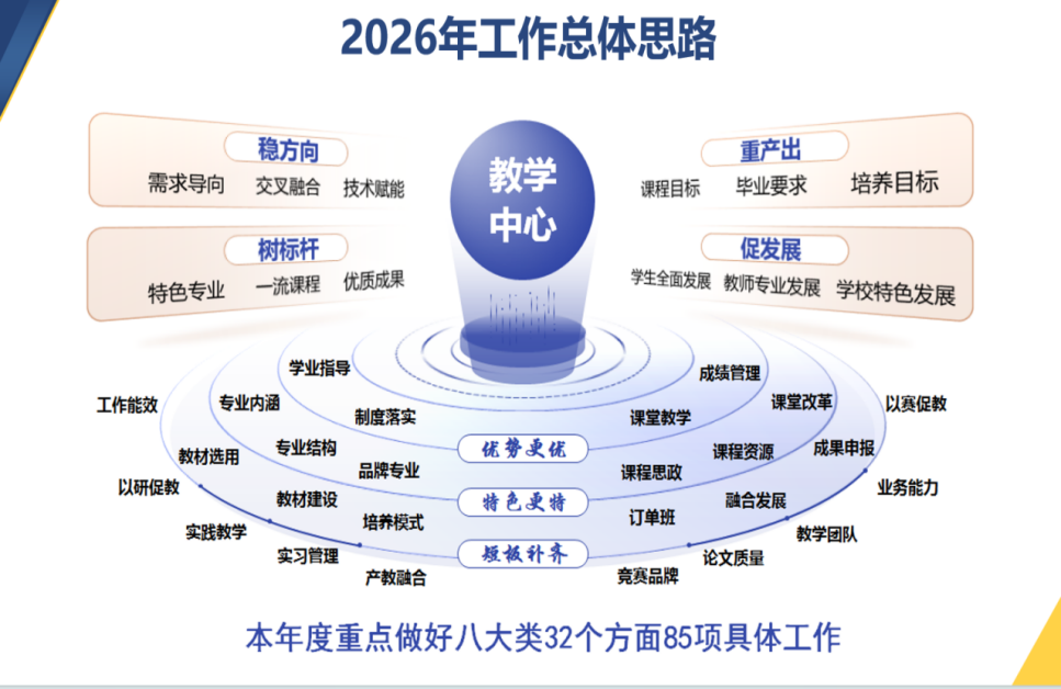 此次会议的召开,为学校2026年教学工作明确了目标方向、理清了工作思路、细化了实施举措。学校教学工作将继续秉持“稳方向、重产出、树标杆、促发展”的工作思路,按照“让优势更优、特色更特、短板补齐”的要求,牢牢把握发展机遇,持续强化教学管理,全面加强教学建设,不断深化教学改革,为加快建成国内高水平应用型大学奠定坚实基础,奋力推动学校高质量发展明显进位。