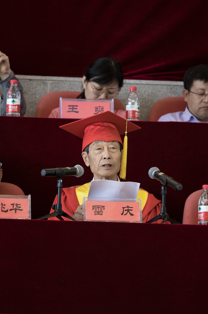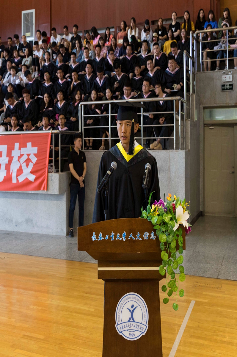 院长雷庆在大会上致辞。他总结了同学们四年来取得的成绩和收获,表达了对毕业生的惜别、祝贺、赞赏之意,祈愿同学们能一生幸福,事业有发展,人生更出彩!最后,他把一首赠别诗送给同学:临辞何必苦叮咛?但感此别事非轻。离家点点慈母泪,去校殷殷业师情。晓行旭日晴光下,宿虑寒塘夜色中。志在高天翔万里,长风助我送飞鸿!
