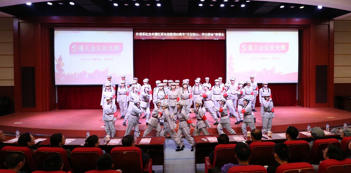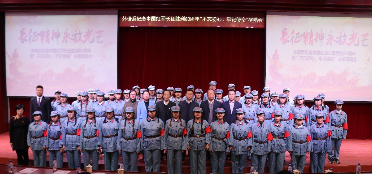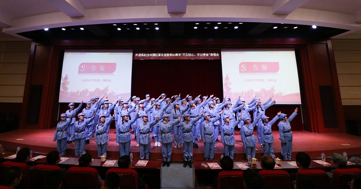 为纪念中国红军长征胜利83周年,结合“不忘初心,牢记使命”主题教育活动,外语系党总支于2019年10月16日下午在报告厅举办纪念中国红军长征胜利83周年主题演唱会。