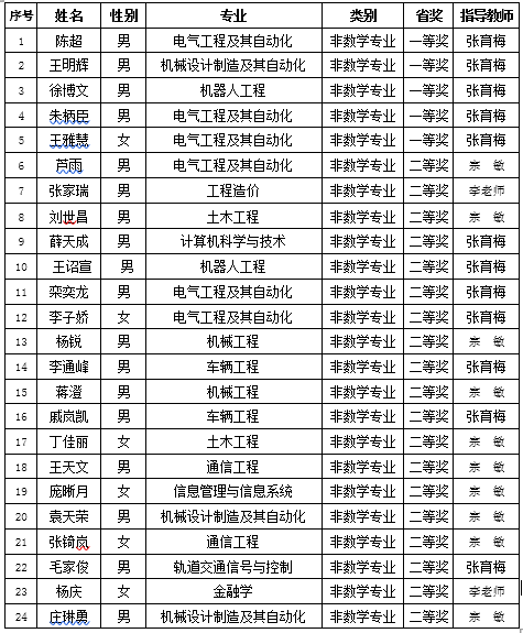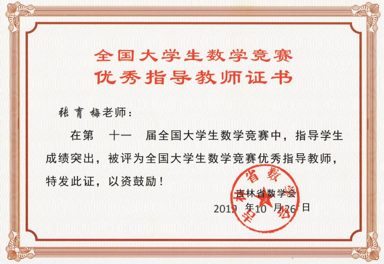 2019年10月26日,竞赛在东北师范大学举行,我院共有35名同学参赛,同来自吉林大学,东北师范大学等30多所高校3000余名学子共同竞技。我院学生成绩优异,分别获得国赛一等奖2人、二等奖3人、三等奖5人,张育梅老师荣获全国大学生数学竞赛优秀指导教师称号;还有24名同学获得吉林省大学生数学竞赛一、二等奖。