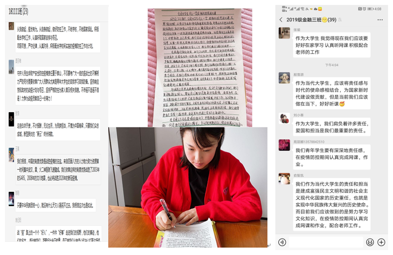 新冠肺炎疫情发生以来,学院认真贯彻落实习近平总书记关于新冠肺炎疫情防控工作的重要讲话和指示精神,严格落实学校“停课不停学”的工作要求,谋划在前,分工明确,精心组织。2月24日,借助超星学习通平台,微信、QQ等软件,我院在全省各高校中率先开讲思政线上第一课:战“疫”我们在一起。通过线上小课堂和思政大课堂的学习,结合同学们的亲身体验,我院大学生同学深深的被我们中国精神、中国力量、中国智慧、中国制度、中国情怀深深振动,更加深刻地理解新一代大学生的“使命、责任与担当”。