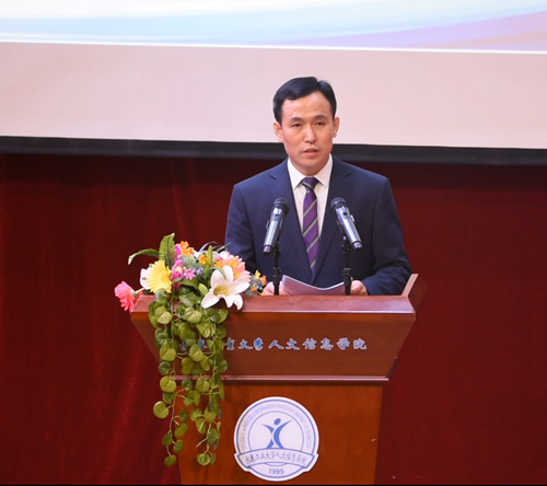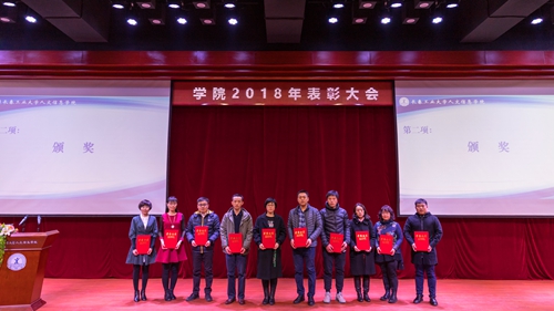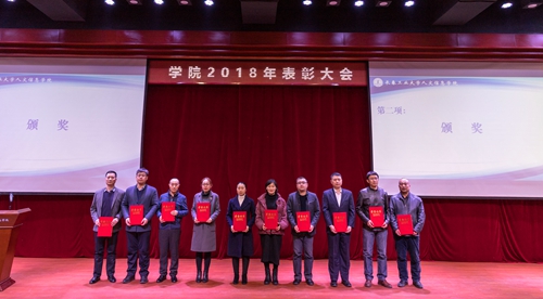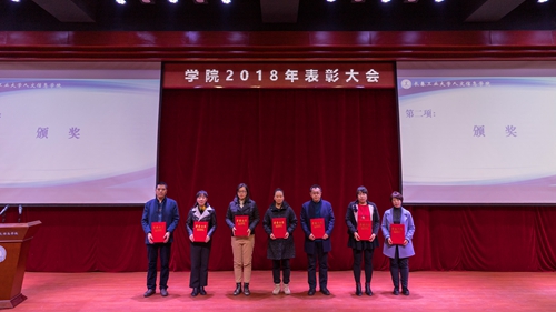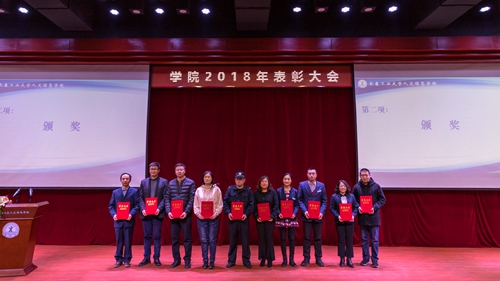 第三项:党委书记程军同志宣读学院《2018年度获得各类奖项情况》。学院荣获各级政府奖励7项;各部门荣获省、市级上以奖励17项;教职工共有49人荣获省、市级以上奖励26项;学生共有502人次、9个班级团支部,在各类竞赛活动中荣获省、市级以上奖励184项。