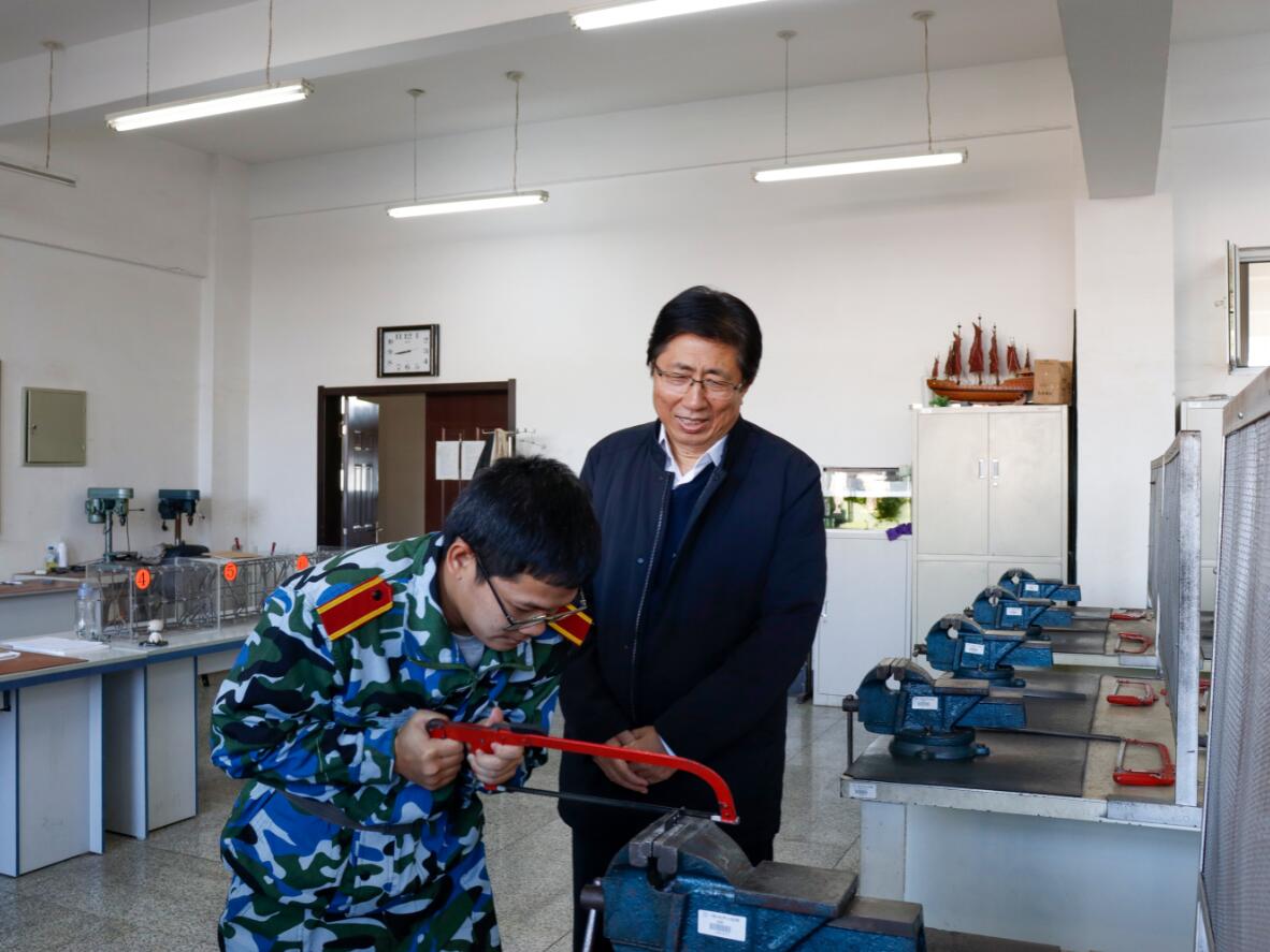 校长潘福林、副校长臧玉萍在钳工实训室观察学生上课