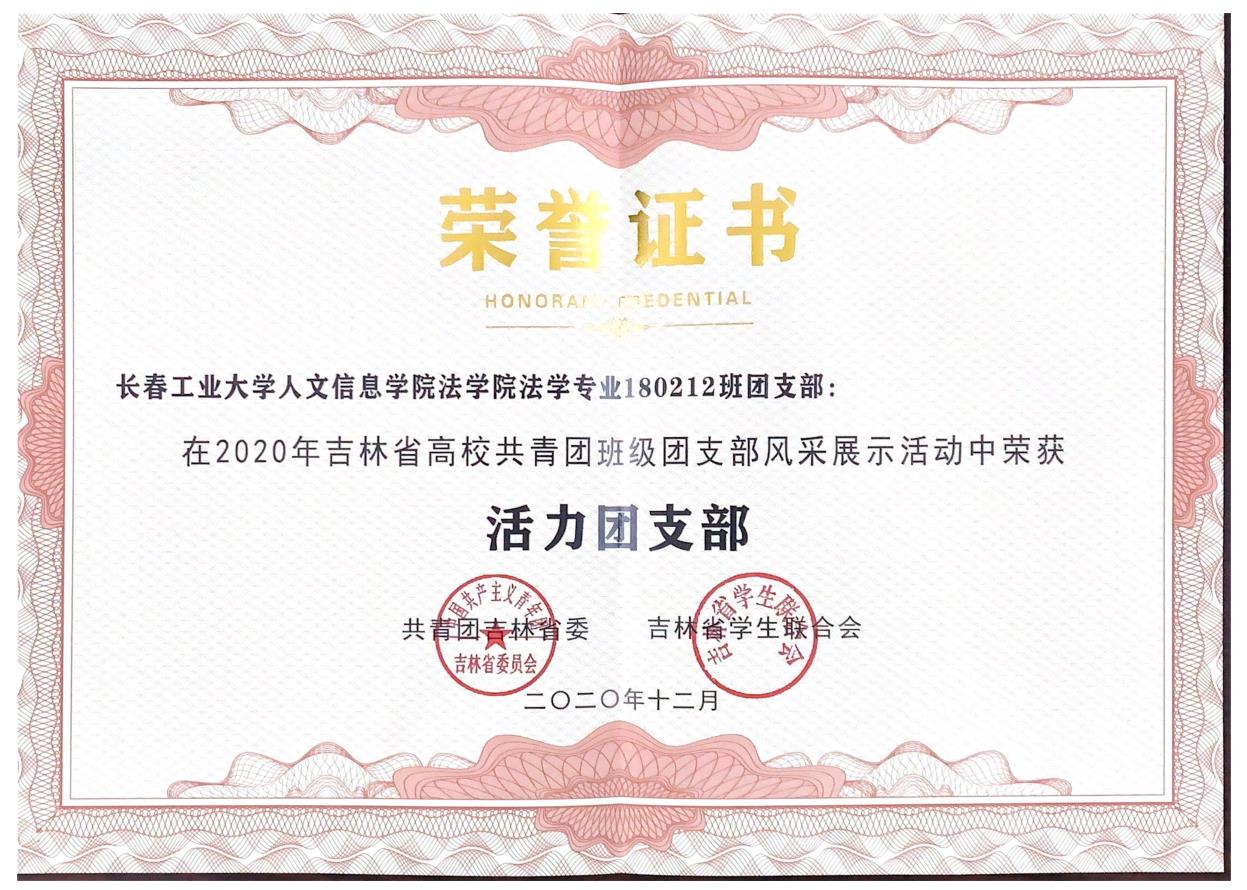 经过多个环节的激烈角逐,我校法学院180212班团支部在2020年吉林省高校共青团班级团支部风采展示活动中荣获“活力团支部”称号、于冰南同学荣获“十佳魅力团支书”称号。