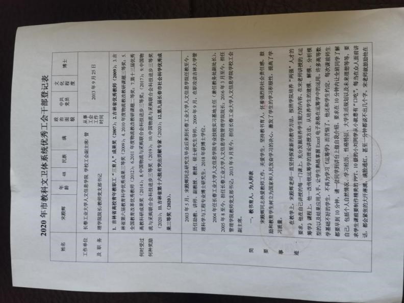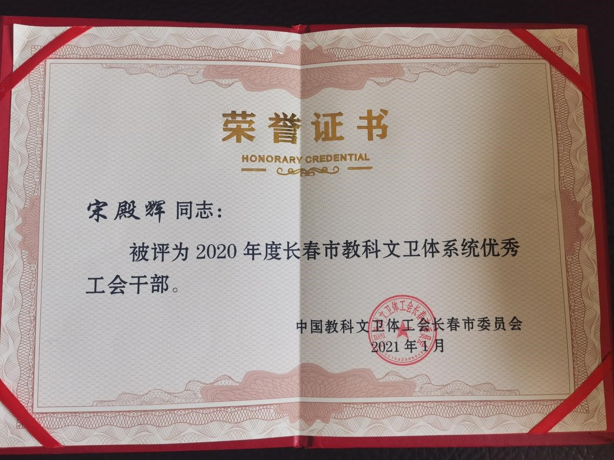 2021年4月8日,长春市教科文卫体工会下发了《关于表彰2020年长春市教科文卫体系统先进集体和先进个人的决定》长会教字〔2021〕2号文件,宋殿辉同志荣获“2020年度市教科文卫体系统优秀工会干部”称号。