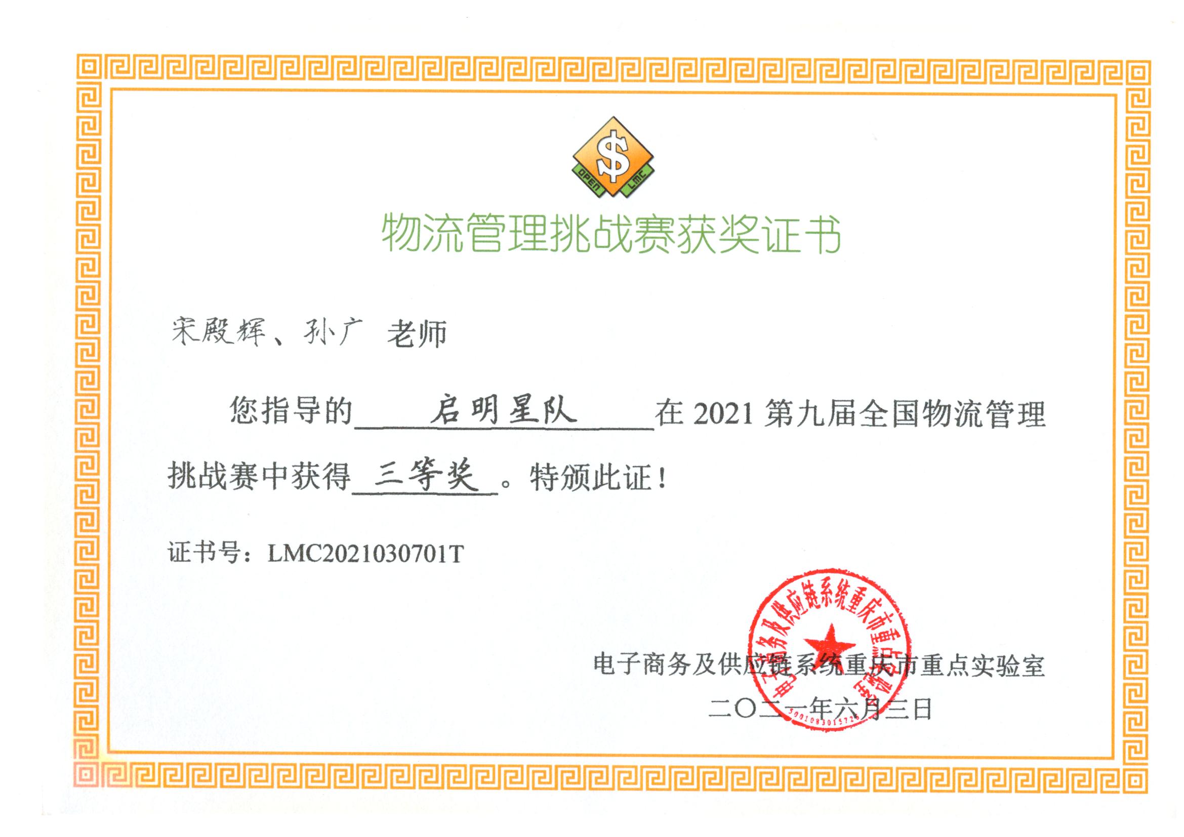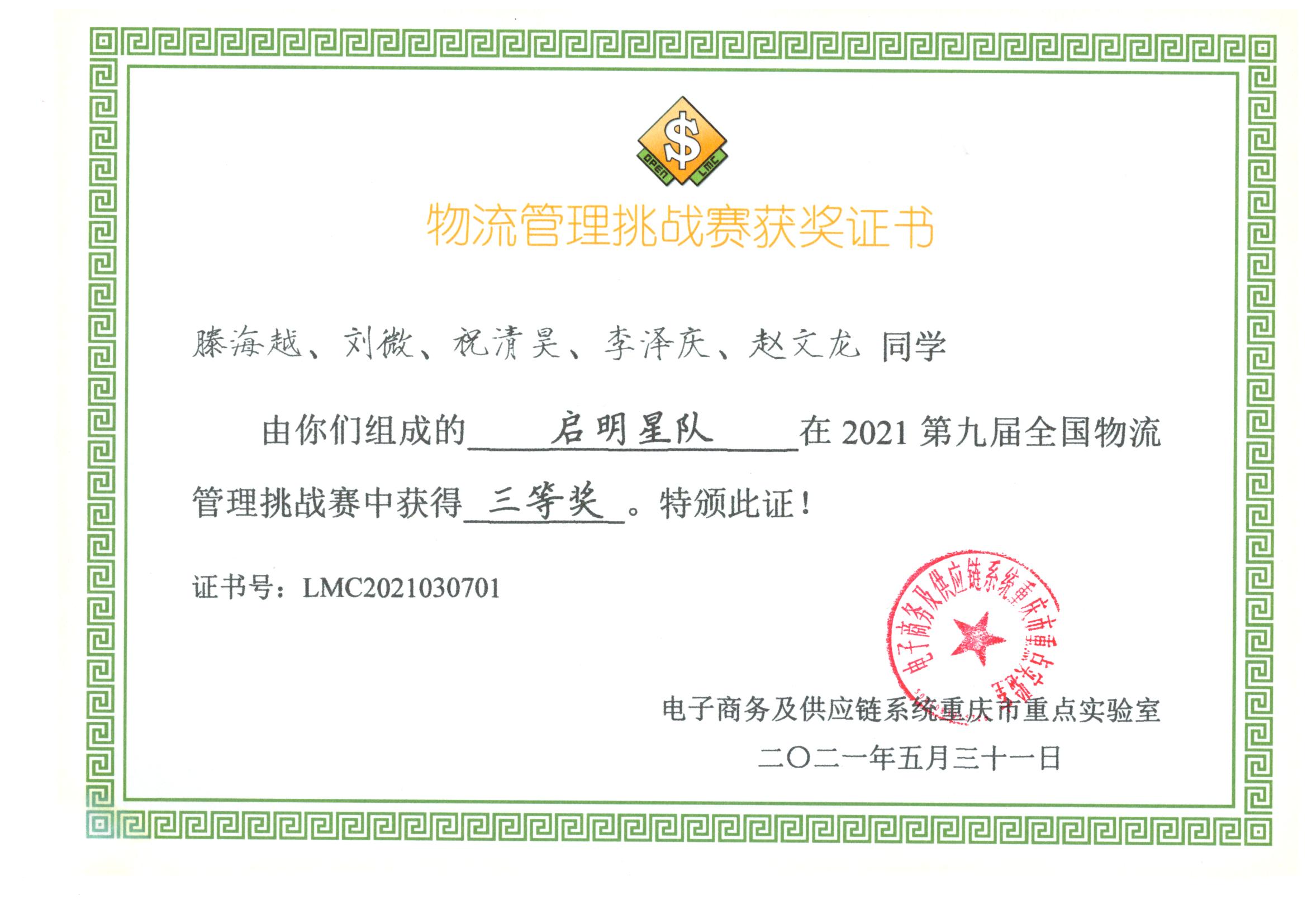 近日,由国家级实验教学示范中心建设单位—重庆工商大学承办的2021年第九届全国物流管理挑战赛落下帷幕,来自全国各高校共60支队伍参加了决赛。在我校管理学院孙广和宋殿辉老师的指导下,由物流管理专业学生腾海越、刘微、祝清昊、李泽庆、赵文龙五人组成的启明星队凭借默契的团队合作和熟练的技能操作,以出色的表现荣获三等奖的佳绩!