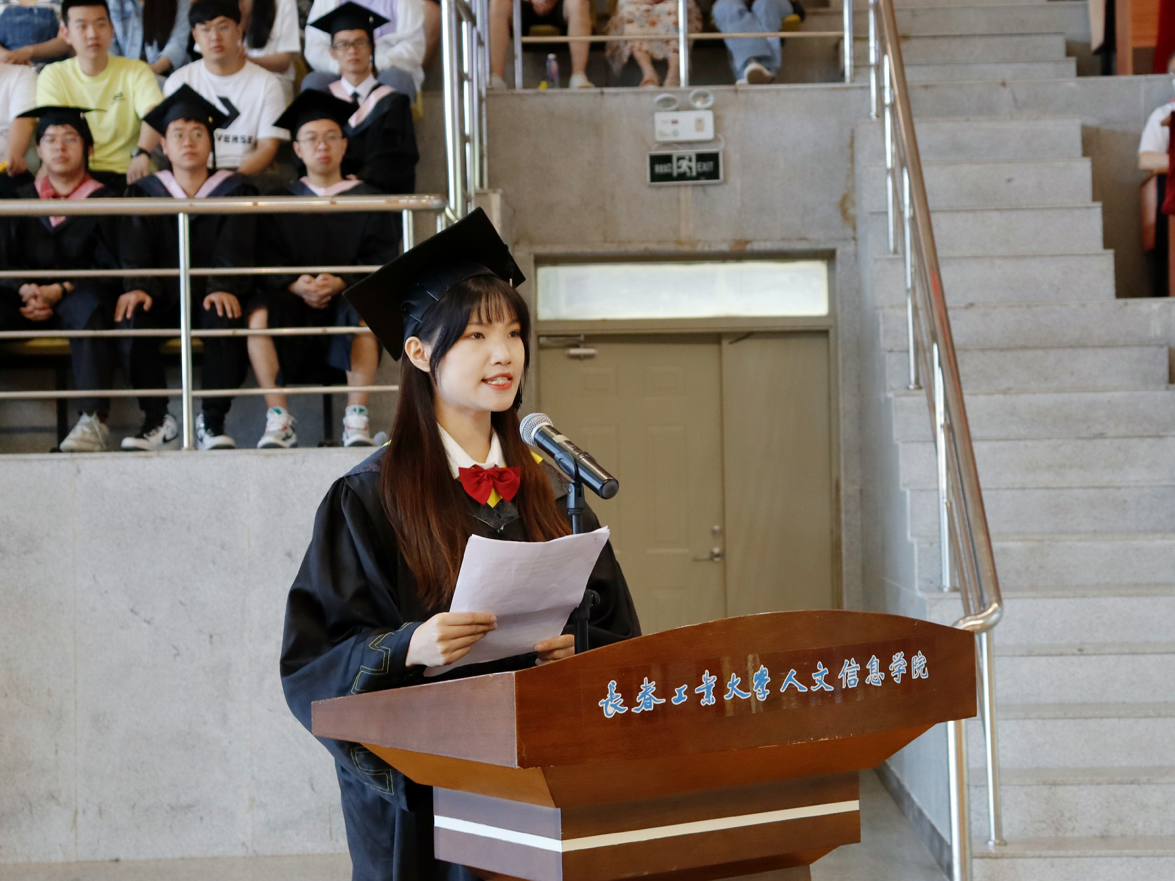 建设工程学院安柯菲同学代表毕业生发言,汇报了四年里践行成人、成才、成功校训,向着“两强”的目标,取得的丰硕成果,表达了对母校和老师们的感恩之情与浓浓的不舍之意,并表示将背负起梦想,用回忆的力量点燃奋斗的激情,用最真的信仰绽放最耀眼的光芒!