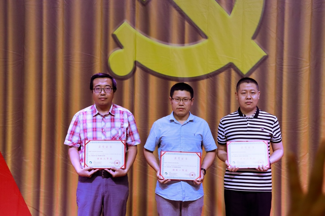 三位办公室主任兼竞赛组组长:姜锋、董会权、宋野分别代表领取电子表格赛项团体三等奖、文字处理赛项一等奖、简报设计赛项二等奖。